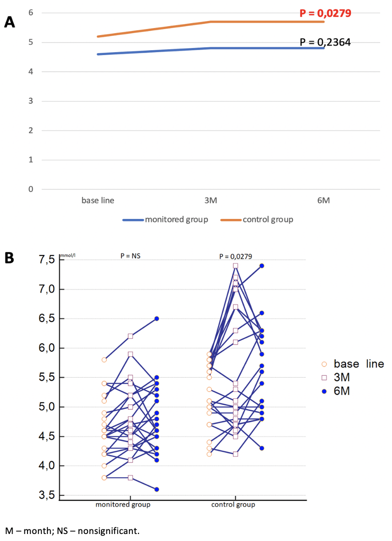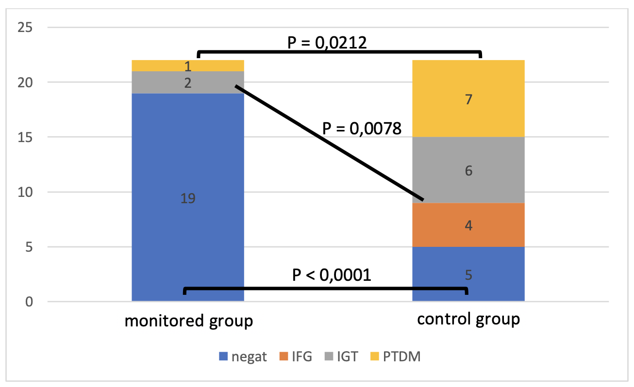 Results: We confirmed a statistically significantly higher IR at 6 months (P = 0.0202) and fasting blood glucose at 3 and 6 months (P = 0.0279) by multivariate analysis in the control group (figure 1, 2). After the end of the follow-up, there were significantly fewer patients with normal oGTT in the control group compared to the study group at 6 months (P < 0.0001), significantly more patients with pre-diabetic condition (impaired plasma glucose, impaired glucose tolerance) (P = 0.0078) and diagnosed with PTDM (P = 0.0212) (figure 3). Significantly lower waist circumference at 3 and 6 months (P = 0.0437, P = 0.0372) and low-density lipoprotein at 6 months (P = 0.0444) were found in the study group compared to the control group. In the study group, the subgroup performing intensive training achieved a significant additional effect on the reduction of waist circumference (P = 0.0173). Patients practicing only aerobic activity achieved significant decrease in triglycerides compared to those practicing combined activity (P = 0.046).
