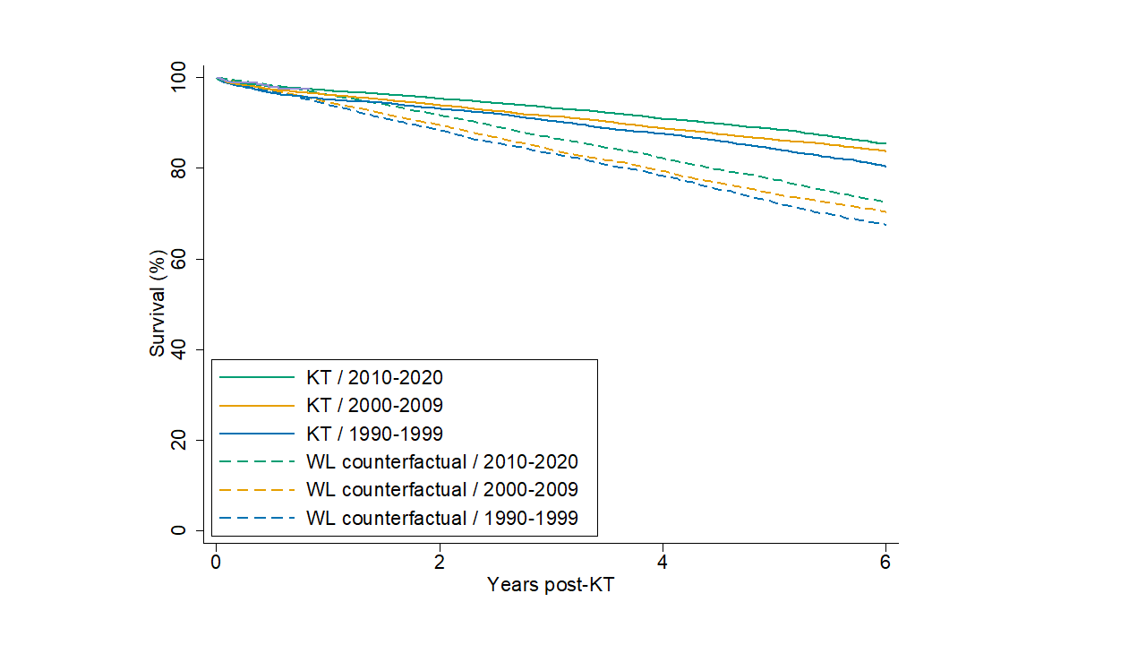 Conclusion: Re-KT is associated with a significant survival benefit when compared with waitlisted patients on dialysis and over time incremental increases in the survival benefit were observed. This benefit exists for older and younger adults. We recommend examination of current practices surrounding re-KT referral and candidacy and the development of guidelines and policies to increase re-KT among patients of all ages.