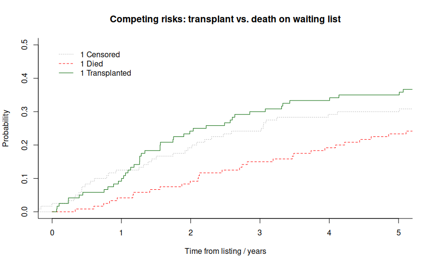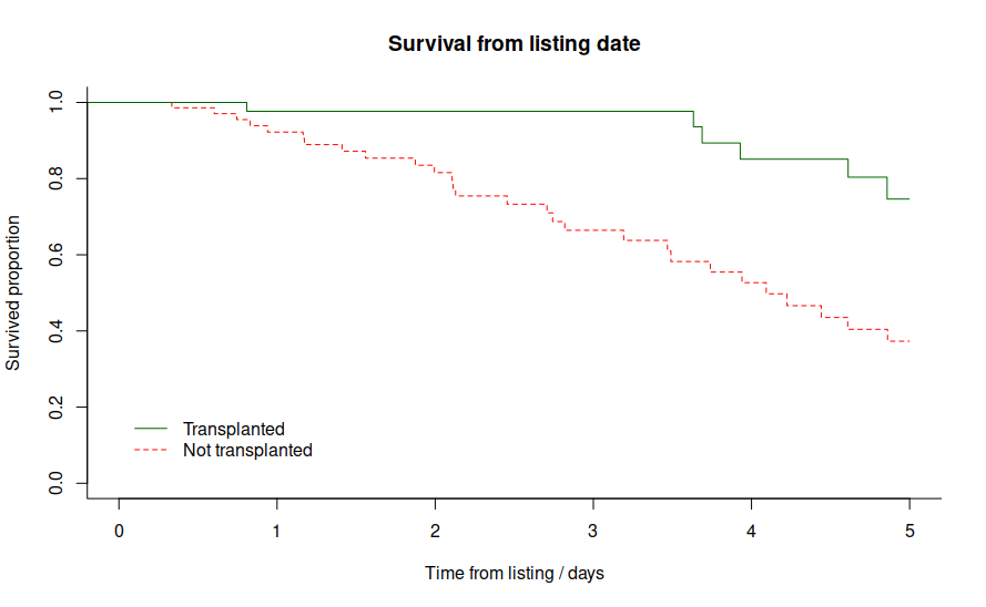 Results: 1 year survival was 98% in the transplanted group compared to 92% in the non-transplanted group. 5 year survival however reported significant differences, with 75% survival in the transplanted group versus 37% survival in the non-transplanted group. In the 5-year competing risks analysis, we observed that the probability of being transplanted is more likely than the risk of death on the waiting . Transplant survival, including death with functioning graft was compared for three age groups (under 50, 50-69 and over 70), and was relatively similar in all groups until year 2, when uncensored transplant survival probability in the over 70s dropped relative to the other groups. At 5 years, there was a 45% transplant survival probability compared to 87% and 76% in the under 50 and 50-70 age groups respectively.