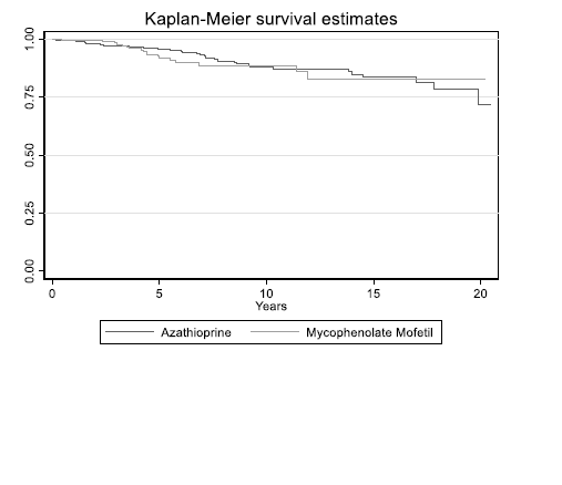 Methodology: Data of 941 patients who had renal transplantation between 1998 and 2018 in University Hospitals of Coventry and Warwickshire were retrospectively reviewed. Data contained information about age, gender ethnicity, type of transplant, the previous number of transplantation, cancer status, medication, dose, duration of medication, skin cancer diagnosis results, non-skin cancer diagnosis results, treatment start date, treatment follow-up with a time gap of 6months, 1, 5, 10, 15 and 20 years, and type of treatment they had. Exclusion criteria: HLA incompatible transplant, patients with pre-transplant skin cancer, patients with incomplete data, and patients who switched from azathioprine to Mycophenolate mofetil or vice versa. Cox proportional hazard regression analysis was used to evaluate factors associated with a higher risk of skin cancer. Analysis of variance (ANOVA) test was used to compare the relationship between Azathioprine versus Mycophenolate Mofetil and subtypes of skin cancer.