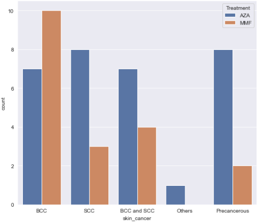 Conclusion: There was no significant difference between Mycophenolate Mofetil and Azathioprine in terms of occurrence of skin cancer .Increase in age, and the number of the previous transplant are associated with a higher risk of skin cancer. Azathioprine is associated with a higher risk of developing SCC while Mycophenolate Mofetil is associated with a higher risk of developing BCC.