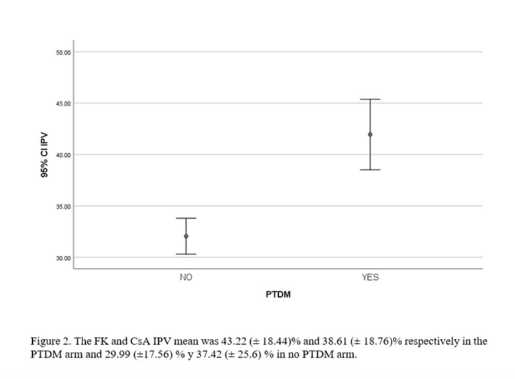 Method: A retrospective study was performed. All patients who received living or deceased-donor kidney transplant in the study period 2002 to 2020 was included and measured Tac/CsA and glucose level at months 0,3,6,9, and 12. Hb1Ac was also determined at 6 and 12 months. Patients who did not have at least 12 months post-transplant follow-up were excluded. PTDM diagnosis was made according the American Diabetes Association (ADA). Intrapatient Variability (IPV) coeficient was estimated by calculating the CV according to the following equation: CV (%) = (SD/mean Tac trough concentration) ×100. Mean concentrations were calculated using all outpatient Tac concentrations between 1 and 12 months. Recipients were separated into 2 groups, low IPV and high IPV, according to the CV cutoff= 37.31% (which is CV median value in the whole cohort).
