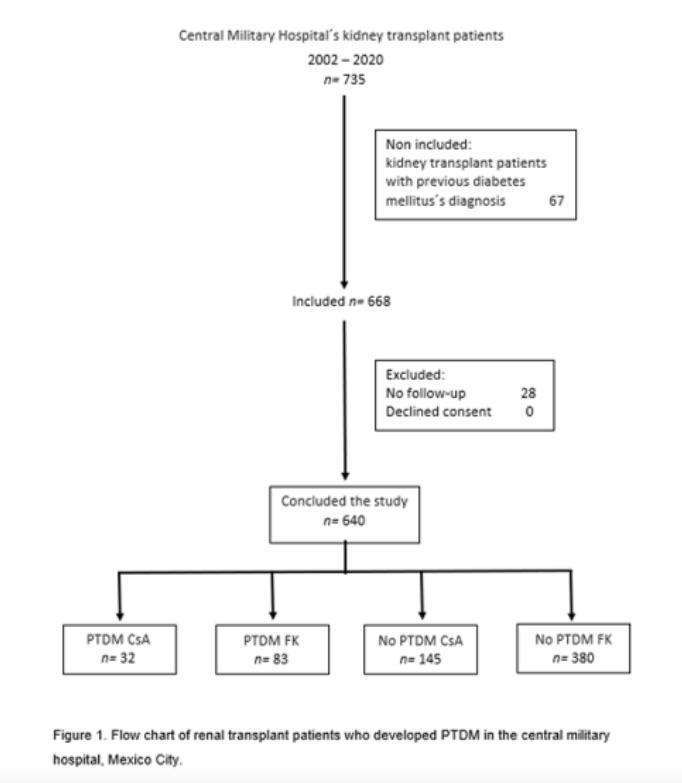 Results: 640 patients were included; 69.4% were transplanted from living related donors; most frequent CKD etiologies were ND and CNG with 33.3%, 30.3% respectively. 64.4% of the transplant recipients were induced with Basiliximab and 1-year postransplant time, 463 patients (72.3%) were on tacrolimus as maintenance immunosuppression and 27.7% on CsA. The mean age recipients was 38.32 (±13.66) years old. Cr mean 1-year postransplant time was 1.39 (±1.19) mg/dL. There were no statistical differences in mean oral steroid dose between groups. Mean levels FK and CsA were 12.41 (±5.31) and 234.34 (±87.80) ng/mL and 9.13 (±5.3) and 194.38 (±92.44) ng/mL in the PTDM and whitout PTDM groups, respectively (p >0.05). 116 patients did met PTDM criteria (18.1%) within first year after transplantation; 55.1% patients were treated with metformin and 33.6% patient with basal insulin. Patients who had tacrolimus high IPV coefficient developed higher PTDM than those with low variability with statistically significant difference (43.22% vs 29.99%, p<0.05). The student's t test value to compare the IPV was 0.03; ANOVA p= 0.00. Our PTDM incidence was lower than other hispanic multicenter cohort.