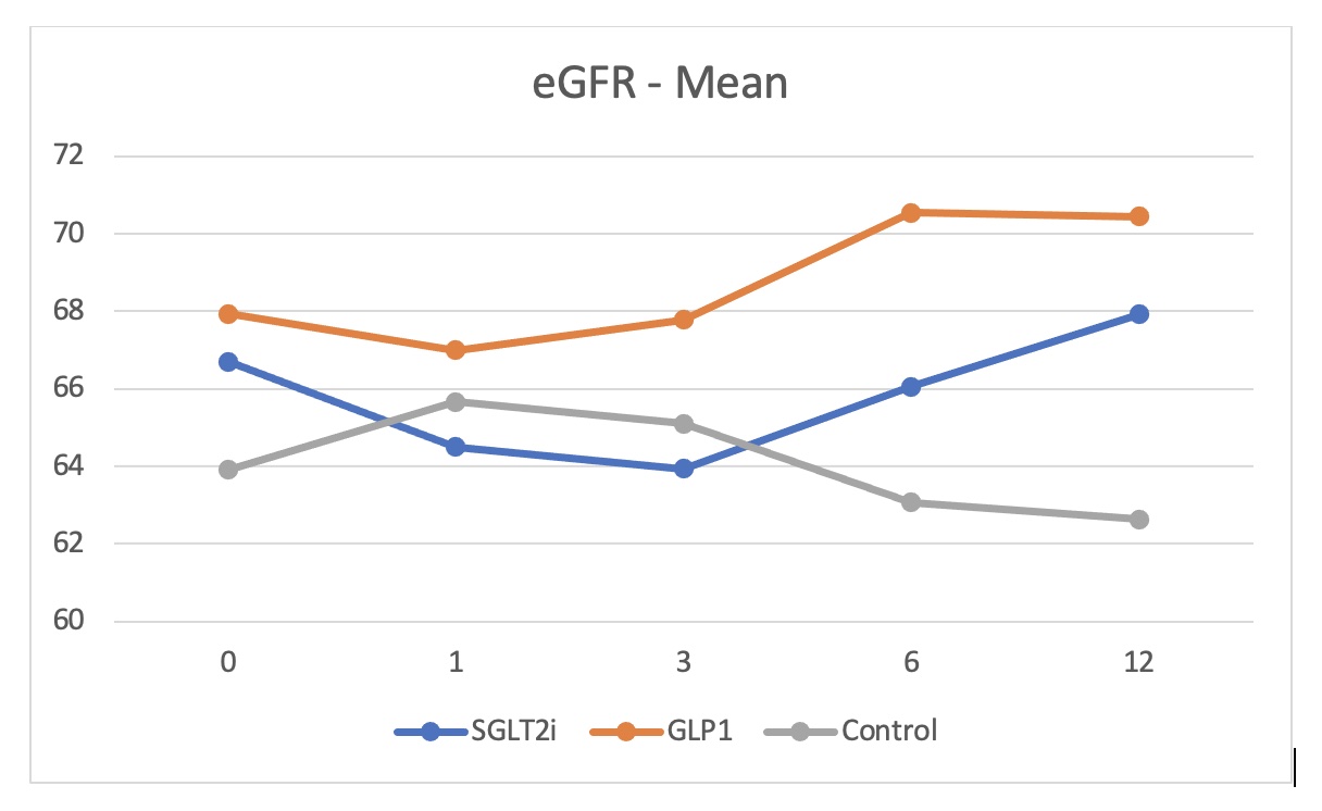 Patients and Methods: We collected data from records of 98 diabetic KTRs who received SGLT2I and another 41 who received GLP-1RA for at least 3 months. We compared them to a matched group of 70 diabetic KTRs on standard of care (SOC) therapy. Patients were at least 3 months post-transplant with stable renal function at the time of inclusion and estimated glomerular filtration rate (eGFR) of at least 25 ml/min/1.73m2. The groups were matching regarding age, gender, body mass index (BMI), type of donor, immunosuppression, post-transplant duration and type of diabetes. HbA1c was higher in both study groups compared to control (8.0% versus 7.2%). Follow up data for one year was recorded.
