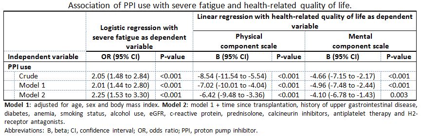 Results: A total of 937 KTR (39% male, mean age 56±13 years) were included at a median of 3 [1-10] years after transplantation. PPIs were used by 656 (70%) KTR. Severe fatigue was more prevalent among PPI users compared to non-PPI users (36% vs. 22%, p<0.001). In addition, both physical and mental HRQoL scores were lower among PPI users compared to non-PPI users (physical: 67 ± 22 vs. 75 ± 19, p<0.001; mental: 75 ± 18 vs. 79 ± 17, p<0.001). In regression analyses, PPI use was independently associated with a higher risk of severe fatigue (OR 2.25, 95%CI 1.53 to 3.30, p<0.001), lower physical HRQoL (B -6.42, 95%CI -9.48 to -3.36, p<0.001) and lower mental HRQoL (B -4.10, 95%CI -6.78 to -1.43, p=0.003). Additional analyses showed that these associations were dose-dependent, present among all individually assessed PPI types and dependent on duration of PPI use.