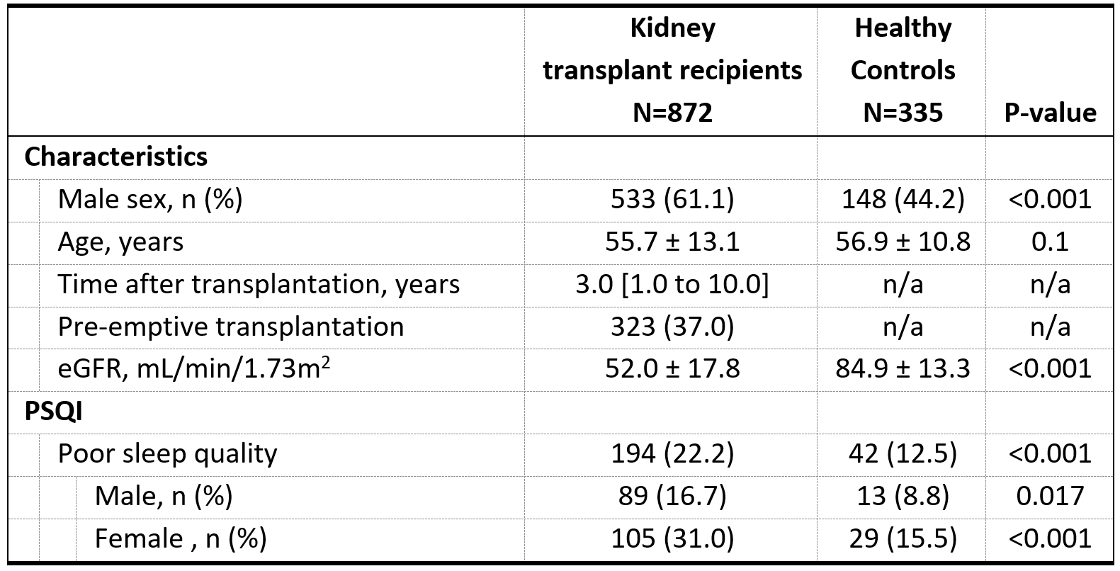 Methods: We used data of KTR (≥1 year after transplantation) and healthy controls (HC) from the TransplantLines Biobank and Cohort Study. Sleep quality was assessed using the validated Pittsburgh Sleep Quality Index. Determinants of poor sleep quality were identified using logistic regression. Associations of poor sleep quality with fatigue, societal participation, and HRQoL were assessed using linear regression. Among a subgroup of KTR, sleep quality was assessed before, at six and twelve months after transplantation, allowing to assess sleep quality trajectories over time.