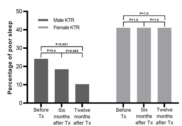 Results: We included 872 KTR (61.1% male, age 55.7±13.1y) with available data on sleep ≥1 year after transplantation, and 335 HC. In total, 16.7% of male KTR and 31.0% of female KTR reported poor sleep quality, which was significantly higher compared to HC (males: 8.8%, PChi-squared=0.017 and females: 15.5%, PChi-squared<0.001, (Figure 1). Next to female sex, more anxiety and calcineurin inhibitor usage were main determinants of poor sleep quality. Additional analyses suggested effect modification by age for the latter, and subgroup analyses confirmed that calcineurin inhibitors were associated with increased risk of poor sleep quality only in patients <57 years old (OR 6.14, 95%CI 1.87-20.15). Poor sleep quality was associated with more fatigue (st. β 0.34, P<0.001), lower ability to concentrate (st. β 0.27, P<0.001), poorer societal participation (restriction score: st. β -0.24, P<0.001), and lower HRQoL (physical component: st. β -0.32, P<0.001 and mental component: st. β -0.40, P<0.001, see Figure 2 for differences per subdomain of HRQoL) among KTR, which all remained independent of potential confounders. Longitudinal data in a subgroup of 124 participants showed that sleep quality improved after kidney transplantation in males (P<0.001), but not females (Figure 3).