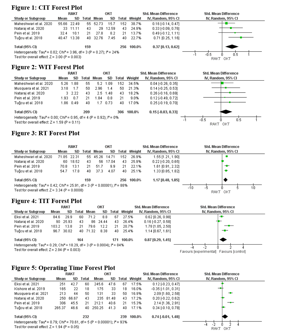 Results: 10 studies yielding 248 patients in the RAKT group and 750 patients in the OKT group were retained for analysis from 327 articles published between 2014 and 2021 that were generated from the database search and another snowballing. The differences in the functional outcomes were not significant across most studies. Of the intraoperative outcomes, pooled results revealed the warm ischemia time (WIT) (SMD = 0.15 [.03, .33], P= 0.11) and operating time (ORT) (SMD = 0.74[-0.01, 1.48], P=0.05) had no significant difference in the RAKT and OKT. The pooled rewarming time (RT), and total ischemia time (TIT) were, however, significantly higher in the RAKT compared to OKT, SMD=1.17[0.48, 1.85], P=0.0008 and SMD=0.87[0.29, 1.45], P=0.003 respectively, but there was no difference in pooled CIT SMD=0.37[0.13, 0.62], P=0.27. The blood loss, incision length and analgesics requirement were significantly lower in the RAKT condition compared to the OKT group at SMD=-0.56[-0.86,-0.27], P=0.0002, SMD=-4.38[-7.32, -1.43], P=0.004, and SMD=-5.75[-8.83, -2.67], P=0.0003 respectively. There was no significant difference for the evaluated postoperative outcome of drain time, and serum creatinine value, SMD=-0.81[-2.73,1.08], P=0.4, and SMD=0.03[-0.17,0.24],P=0.76 respectively, whereas the length of hospital stay and wound infections was smaller for RAKT SMD=-0.37 [-0.65,0.08], P=0.01, and OR 0.20 [0.06-0.62], P=0.006 respectively as shown in figures 1,2 and 3.