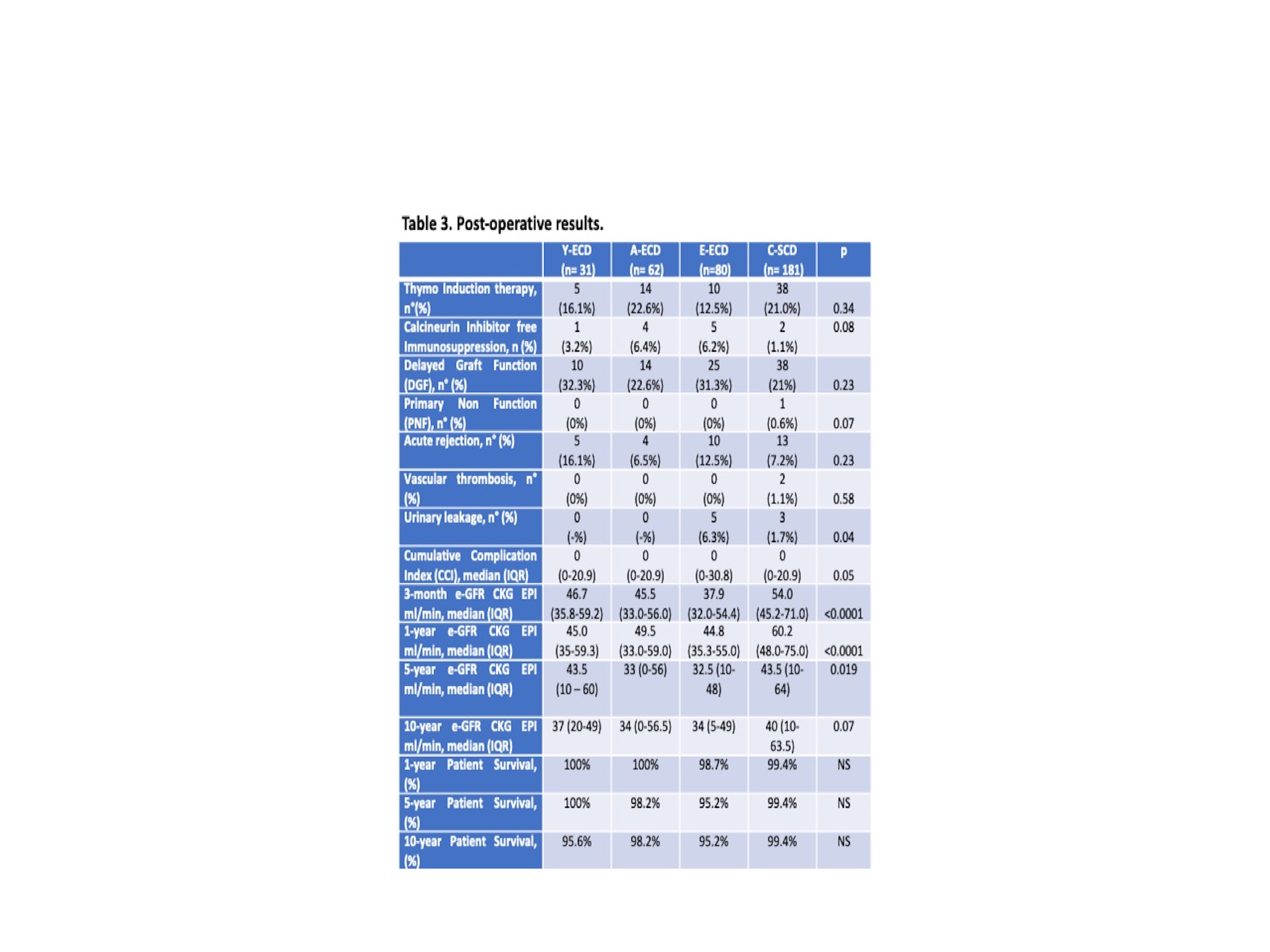 Method: We considered patients underwent SKTx to our Center from January 2005 to December 2021. We considered 4 groups: Young (Y)-ECD, SKTx from ECD 50–59-year-old with at least 2 features between: creatinine >1.5mg/dl, arterial hypertension or cerebrovascular accident, in any combination; Aged (A)-ECD: SKTx from ECD 60–69-year-old; Elderly (E) ECD: SKTx from ECD ≥70 year-old, and the Control (C)-SCD: SKTx from SCD <60 year-old. Groups were compared for primary non function (PNF), delayed graft function (DGF), vascular thrombosis, urinary leakage, acute rejection rate, cumulative complication index (CCI), e-GFR (CKG EPI), 1-, 5-, 10-year patient survival.