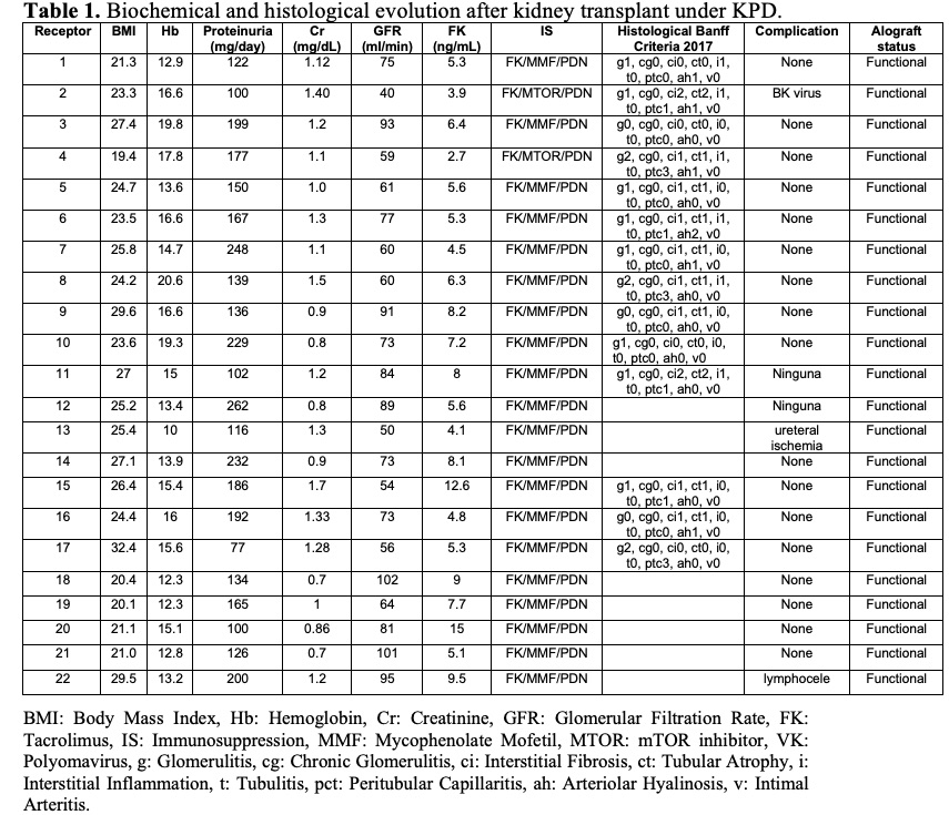 Results: 22 kidney transplants were performed under this program. The most common CKD etiology was not determined (ND) with 31.8%. Survival of the graft and the patient 1 year after transplantation was 100%. The post-transplant glomerular filtration rate receptor (GFR) was 72.5 (± 17) ml/min/1.73 m2SC; the GFR post-donación was 75.04 (± 15.98) ml/min/1.73/m2SC. 36.3% of hypersensitized patients were successfully transplanted whitout plasmapheresis. The mean age of the recipients was 35.67 (± 12.45) years.