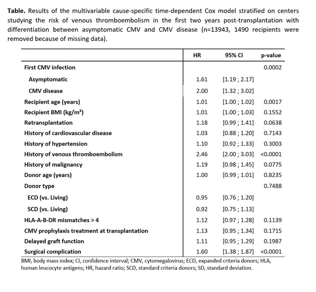 Methods: We conducted a study on the multicentric DIVAT database which was carried out prospectively and exhaustively on key dates during post-operative follow-up of clinical and biological data for all incident KTR belonging to 8 French transplantation centers (CNIL decision DR-2015-087, N°914184). Multivariable cause-specific time-varying Cox models stratified on centers were used to estimate the relationship between the risk of VTE occurring after well documented first CMV infections (asymptomatic or disease) and which were considered as a time-dependent variable.