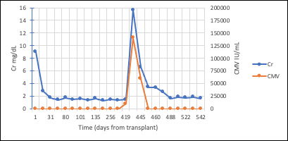 Intravenous ganciclovir was initiated with improvement in CMV DNAemia and concomitant improvement in renal function. He was transitioned to oral valganciclovir after 10 days of intravenous therapy with complete resolution of CMV DNAemia and steady improvement in renal function. His SCr continued improve and nadired at 1.7 mg/dL. At 2-year follow-up, his SCr was 1.74 mg/dL.
