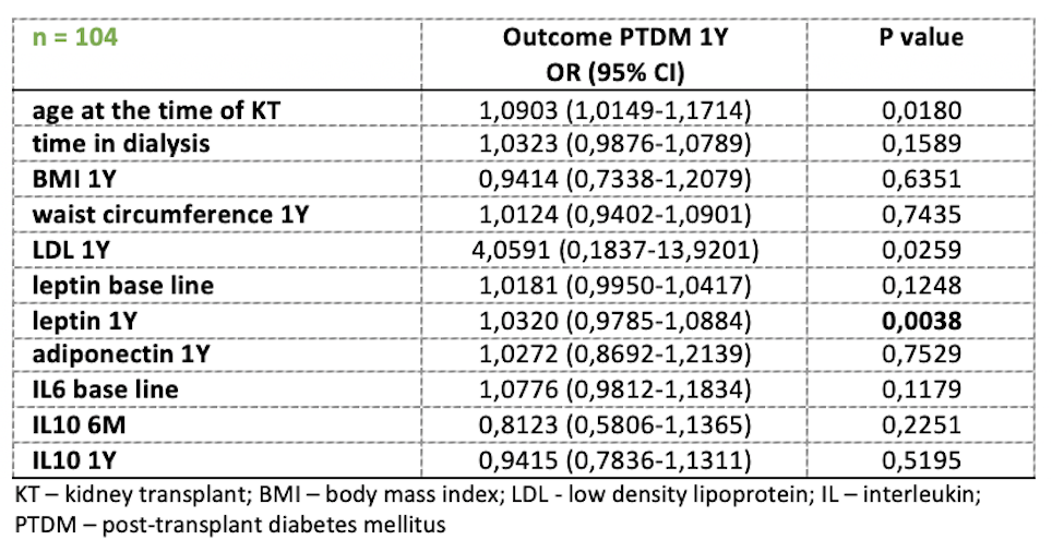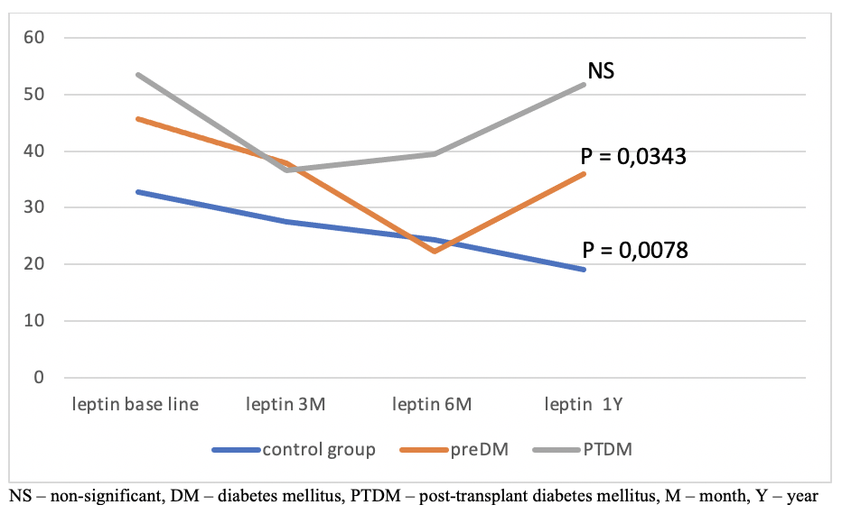 Conclusion: We confirmed that elevated leptin level 12 months after KT is associated with the development of PTDM. Levels of inflammatory process mediators (IL-6 and IL-10) did not correlate with an increased incidence of metabolic complications. Their importance seems to apply in the event of acute rejection, which requires further investigation.