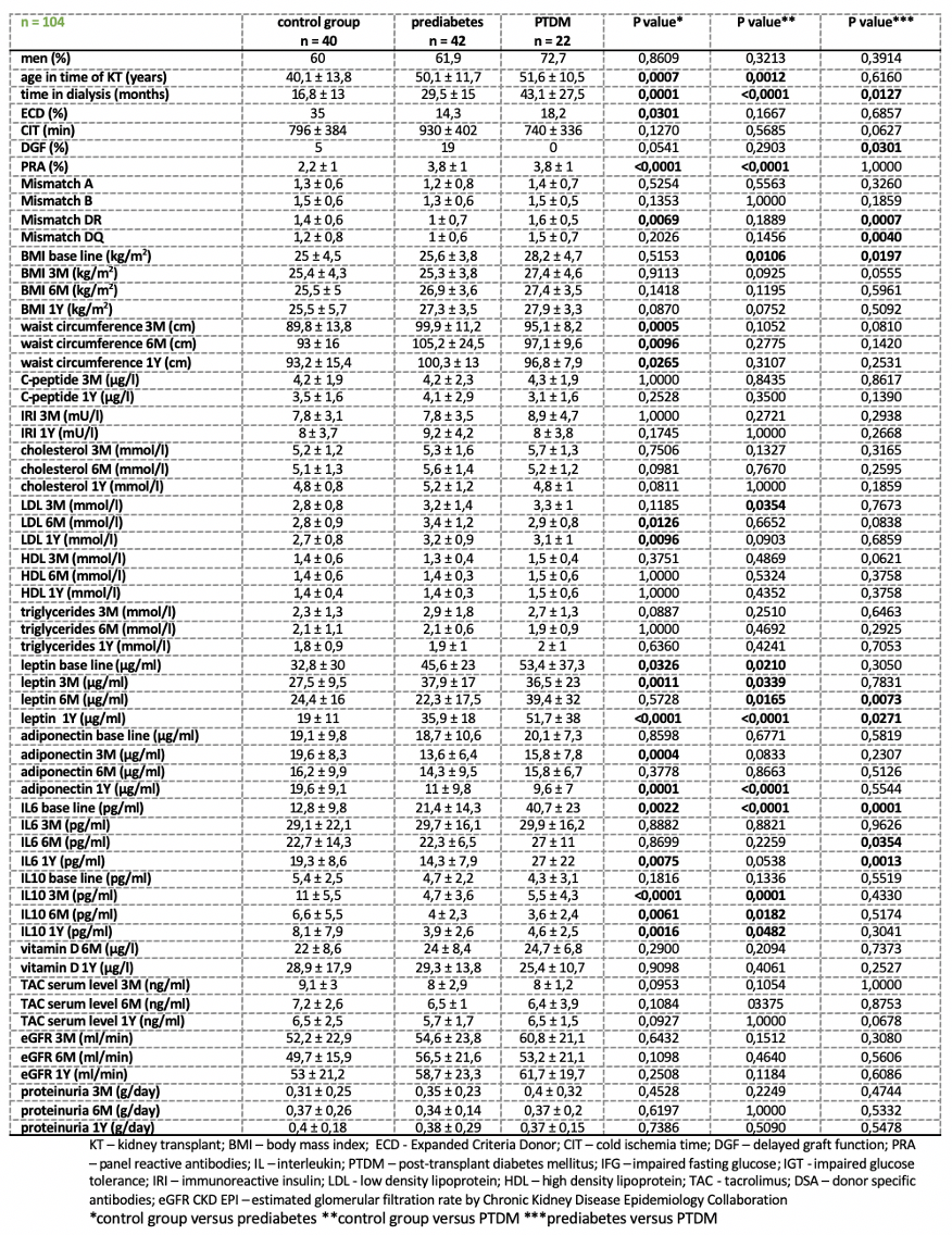 Methods: In the prospective analysis, the studied sample (n = 104) was divided into three groups: 1. control group, 2. patients who developed a pre-diabetic condition after KT (impaired glucose tolerance, fasting hyperglycemia) and 3. patients who developed de novo PTDM. Pre-transplantation and subsequently at 3, 6 and 12 months after KT, we recorded the basic characteristics of the donor and recipient, including parameters reflecting graft function, metabolic (lipid profile, glucose metabolism parameters) and anthropometric parameters. At the same time, we monitored the levels of adipocytokines (adiponectin, leptin) and interleukins (IL-6, IL-10) during the monitored period (Table 1).