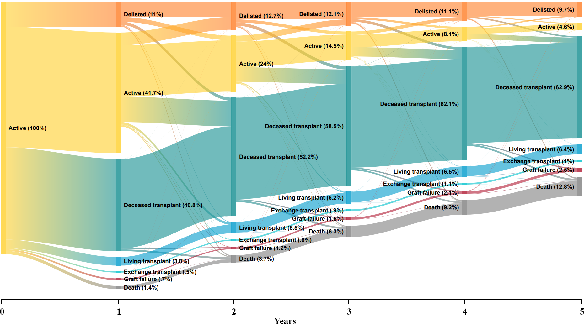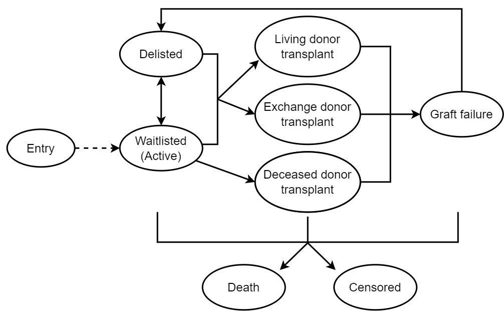 Method: We included all incident patients waitlisted for their first kidney transplant from deceased donor in Australia between 1st Jul 2006 and 31st Dec 2019. We described all clinical transitions after entering the kidney waitlist including: active on waitlist; delisted; kidney transplant; graft failure; death and censored (Fig 1). We summarized the median time to each transition until first transplant and annual percentages in each clinical state until 5 years. We used multi-state Markov model to evaluate factors associated with transitions after entering the waitlist until first transplant, reporting the hazard ratio (HR) for each transition.