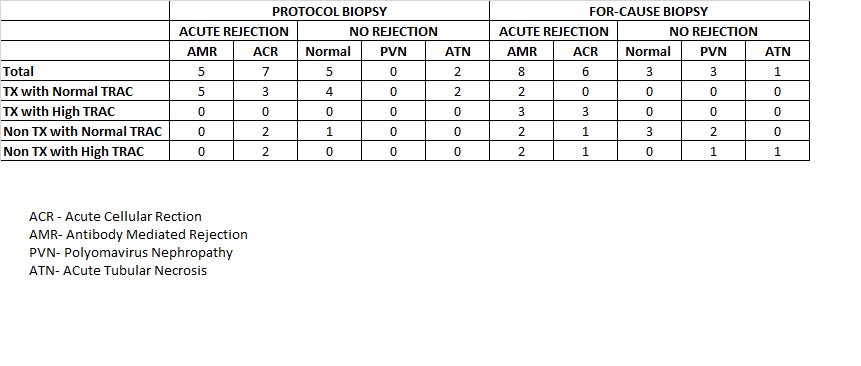 Methods: We selected 40 patients who had a biopsy either for cause or for protocol along with OmniGraf™ and serum creatinine checked around the same time of the biopsy. Patients were divided into 2 major groups, 1.protocol, and 2. For-cause biopsy, later subdivided into 4 groups depending on the OmniGraf™ result combinations. TX is considered No Rejection, Non-TX is considered increased risk of subclinical rejection.TRAC is the dd cf DNA test, High TRAC more than 0.7% is considered increased risk of rejection.