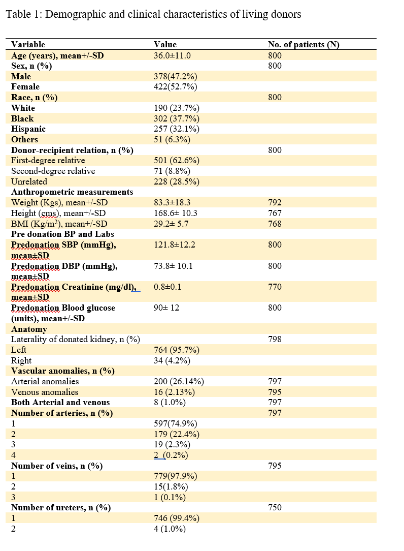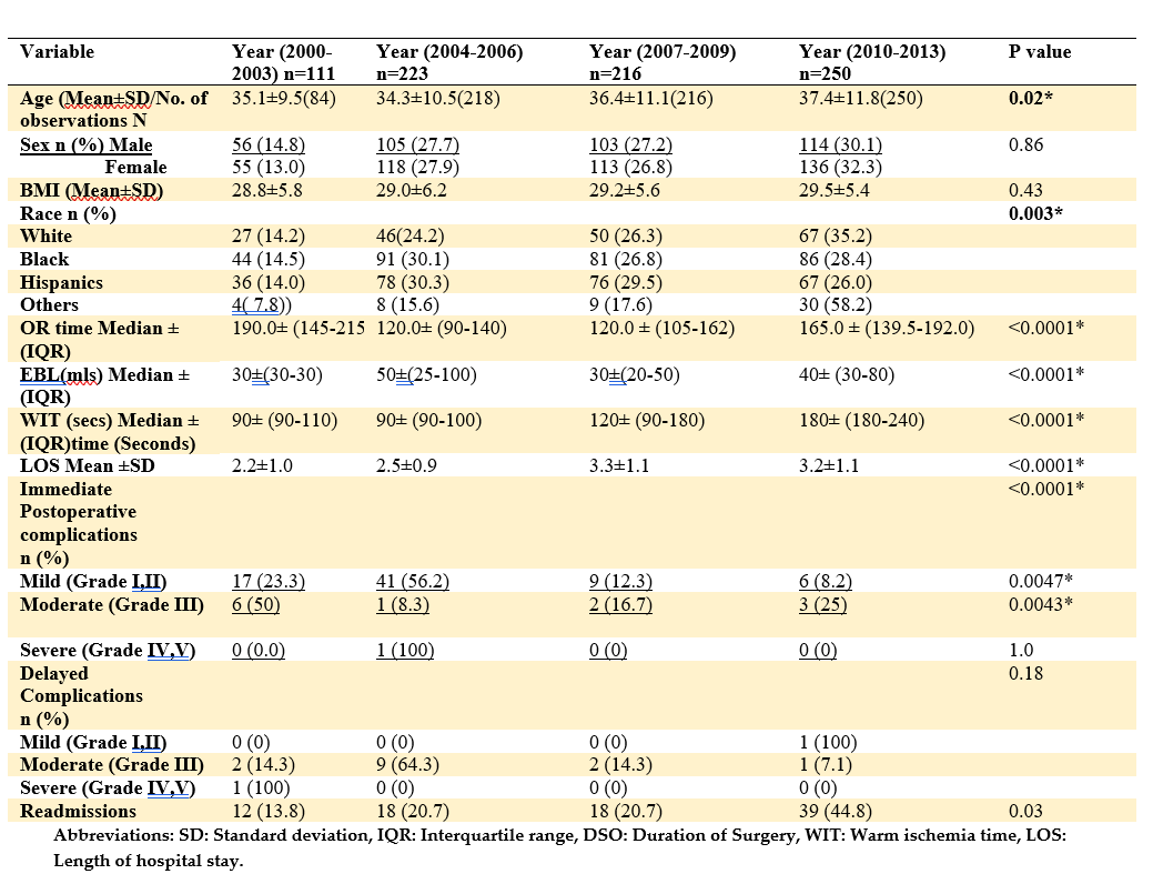 Results: A total of 800 consecutive donors underwent robotic-assisted donor nephrectomy. The mean donor age was 36±11.0 years, and there were more females than males. The BMI varied from 17-53kg/m2 with a mean BMI of 29.2± 5.7 Kg/m2, and 62.6% of donors were first-, degree relatives of the recipients. The proportion of left kidneys procured was 95.7%. Arterial anomalies were present in 26.1% of donors, while 2, 3, and 4 arteries were present in 22.4%, 2.3%, and 0.2%, respectively. Venous anomalies were present in 16 patients overall. Most procedures (98.8%) were conducted with robotic assistance. Five cases (0.6%) were converted to an open, while another 4 patients had another concurrent procedure during the robotic nephrectomy, as shown in table 1. From the year 2000-to 2013, a gradual increase in donor age was observed (p=0.01) (Table 2). There were no changes in the male to female ratio and the mean BMI temporally. Donations across all races increased significantly (p=0.03) except Hispanics. Statistically significant increases were noted in ORT (p<0.0001), WIT (p<0.0001), EBL (p<0.0001), and LOS (p<0.00101) between the last and previous eras, as the new surgeons and fellows took over as console surgeons. Although the complication rates significantly decreased from 2000-2013 (p<0.0001), there has been a steady increase in readmission rate over time (p<0.0001), as shown in the table below (Table 2).