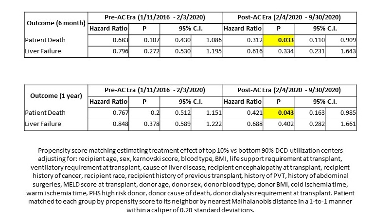 Results: 2299 DCD liver transplantation recipients were included in this study, 2012 in pre-AC and 287 in post-AC eras. High DCD volume (top decile) centers had significantly improved 6-month (HR: 0.32, 95% C.I.: 0.11-0.91, P = 0.033) and 1-year (HR: 0.42, 95% C.I.: 0.17-0.98, P = 0.043) patient survival in the post-AC era compared to bottom 90% centers by volume. No significant differences were noted in 6-month or 1-year liver graft survival in either era.