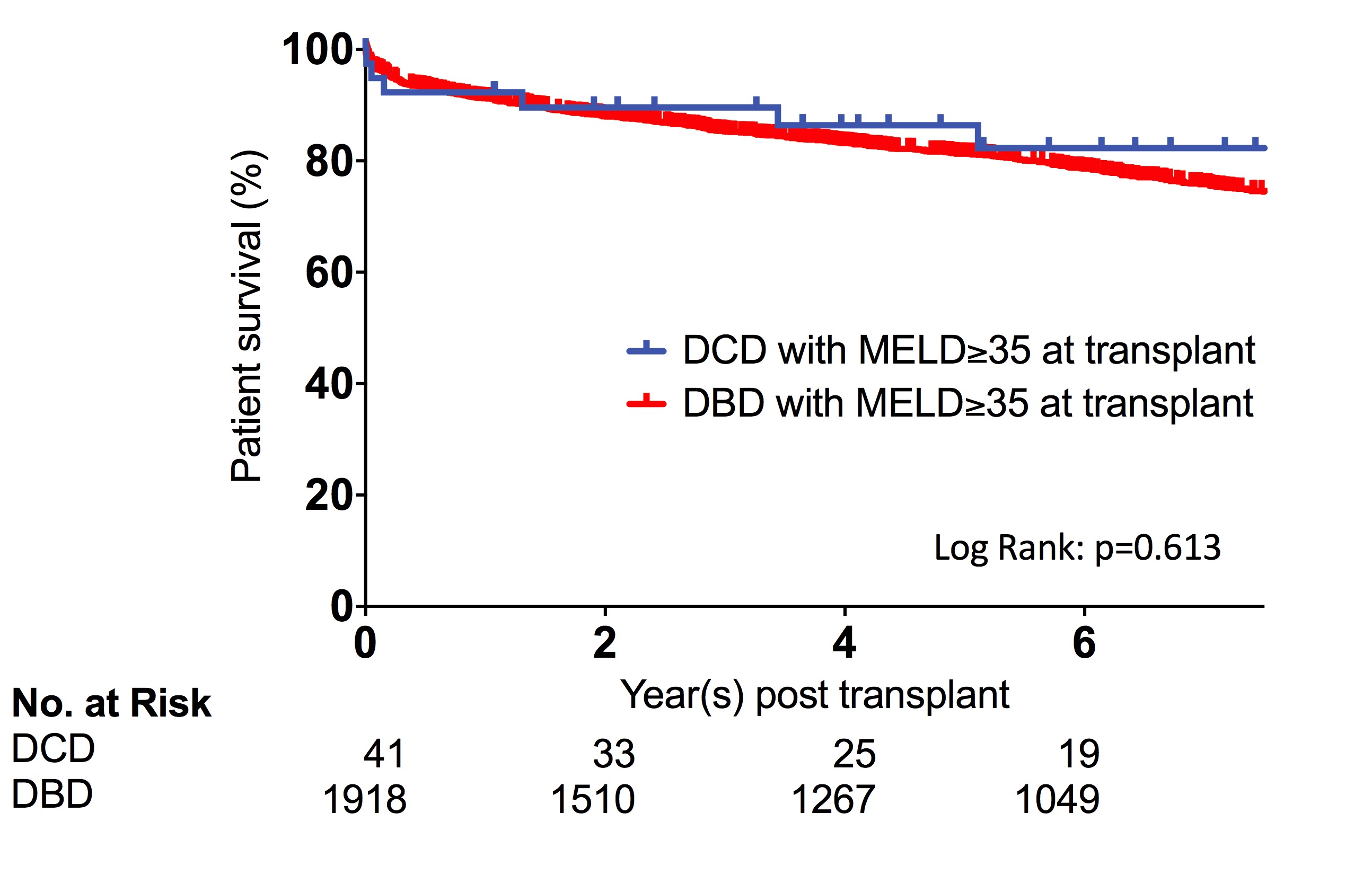 Conclusion: DCD transplant in MELD of ≥35 recipients is feasible and can achieve similar one-year survival rates compared to DBD recipients with MELD≥35. Ischemic cholangiopathy remains present at an expected rate.