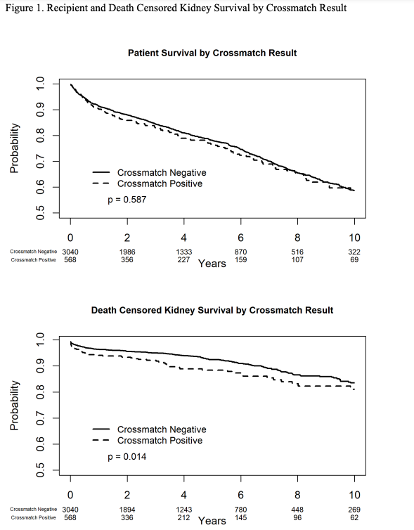 Methods: We analyzed the SRTR standard analysis file for all primary SLK recipients between 2003 and 2020 with available XM and induction regimen data. According to the XM status, recipients were grouped: crossmatch negative (XM-) N=3040 and XM+ (of any capacity) N=568. Kaplan-Meier curves were generated to examine recipient, death-censored liver and kidney survival by XM status. Cox proportional hazard models were used to investigate the association between XM status and outcomes of interest with follow-up censored at ten years. Models were adjusted for recipient age, sex, MELD scores, duration on the liver waitlist, induction immunosuppression, steroid maintenance, hepatitis C virus status, donor age and sex, local vs. shared organ status, liver and kidney cold ischemia time and previous liver transplant status.