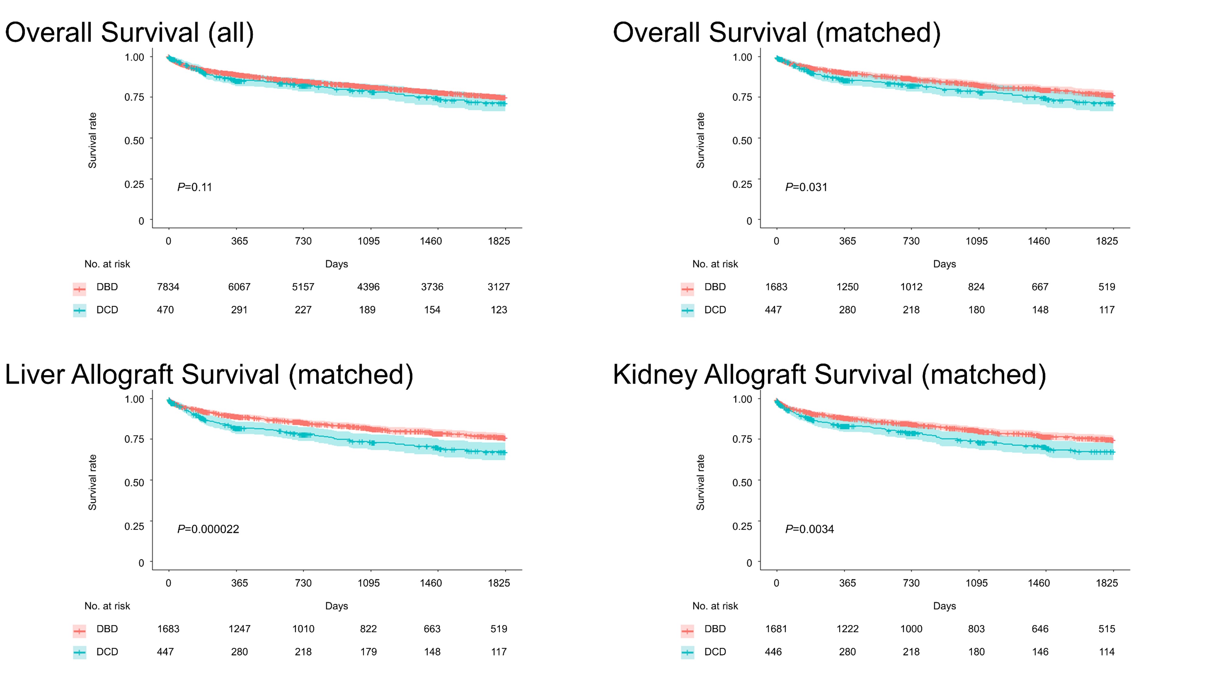 Results: In the United States, 8733 SLKT were performed during the study period (499 SLKT from DCD and 8234 from DBD). Recipients of DCD organs, when compared to recipients of DBD organs, were older (median age 59 vs 58 years, P=0.005), had lower prevalence of dialysis (62 vs 68%, P=0.003), lower Model for End-Stage Liver Disease (MELD) score (24 vs 29, P<0.001) and longer wait-time (89 vs 68 days, P=0.009). Donors of DCD organs were younger (median age 33 vs 35 years, P<0.001), had shorter cold ischemia time in liver (5.8 vs 6.0 hours, P<0.001) and in kidney (9.5 vs 10.5 hours, P<0.001), and had similar kidney donor profile index (31 vs 30 %, P=0.18) compared to DBD donor. The most common primary diagnosis for both recipient groups was alcohol-related liver disease, while non-alcoholic steatohepatitis was more common in DCD group (28 vs 21%). Long-term outcomes including five-year overall survival and liver graft survivals were inferior in DCD recipients (71.4 vs 74.8%, P=0.11; 74.0 vs 67.1%, P=0.0011). After propensity score matching, five-year overall survival and liver graft survivals were inferior (71.4 vs 76.4%, P=0.031; 67.1 vs 76.0%, P<0.001). Multivariable cox-regression analysis in the matched-cohort showed that DCD was an independent risk factor of mortality (hazard ratio {HR}- 1.33; 95% Confidence interval{CI}, 1.04-1.68; P=0.021) and liver graft failure (HR- 1.54; 95% CI, 1.24-1.92; P<0.001). For kidney allograft outcomes in matched-cohort, delayed graft function was higher in DCD (36 vs 20%, P<0.001) and five-year kidney graft outcome was inferior in DCD (67.3 vs 74.7%, P=0.0034). The most common listed causes of five-year mortality were infection (21.4%) and multi-organ failure (20.8%) and there were no differences between two groups. Other factors associated with mortality were recipient older age (HR 1.03; 95%CI 1.02-1.04, P<0.001), male recipient (HR 1.32; 95%CI 1.06-1.64, P=0.014), and donor older age (HR 1.01; 95%CI 1.00-1.02, P=0.024).