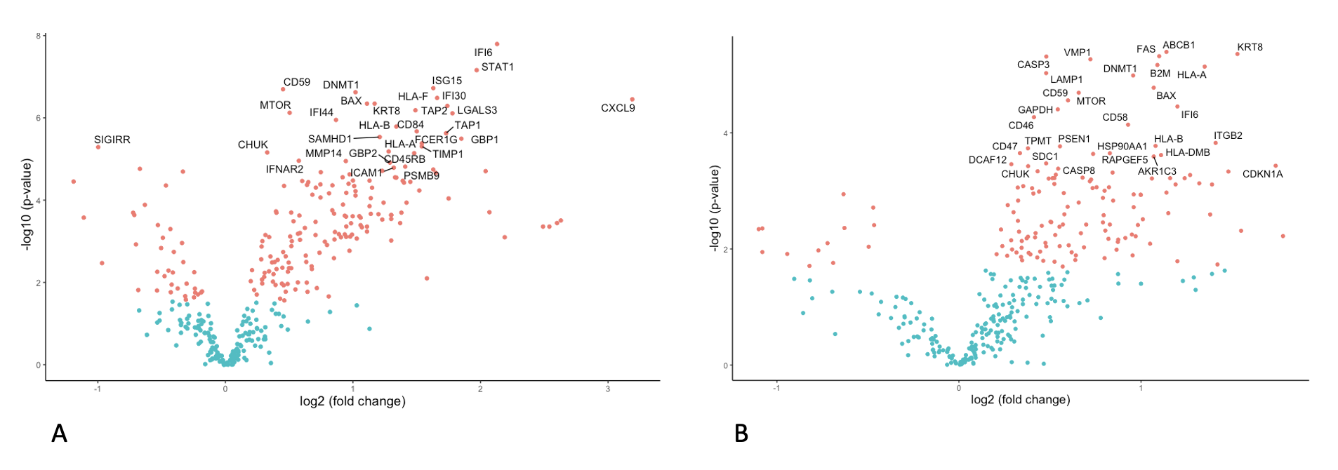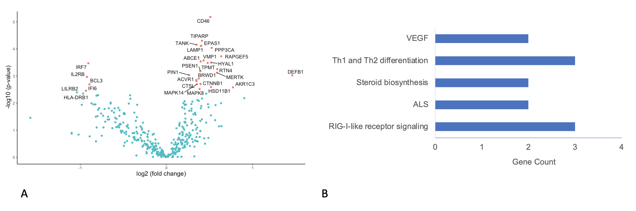 Results: There were significant differences in DE between ACR and normal liver tissue (Figure 1A, 142 genes), and in PA there was significant upregulation of genes involved in the common rejection module (n=4 genes) and antigen processing and presentation in ACR versus normal (n=15 genes, p<0.001). Similarly, there were significant differences in DE between CR and normal (Figure 1B, 145 genes) and PA showed significant upregulation of genes involved in antigen processing and presentation (n=8) and allograft rejection (n=6 genes). In DE comparing ACR and CR, significant differences in 28 genes were identified (Figure 2A), with PA demonstrating small differences in a variety of immunologic pathways (Figure 2B).