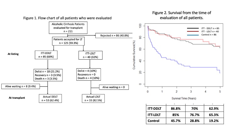 Method: This was a retrospective study from a university center. All data was retrieved from a prospectively collected database. All liver transplant canddiates who had ALD and underwent transplant evalution from 2008 to 2021 were analyzed. Patients were divided into 2 groups. For candidates who had at least one eligible live donor, they would be considered as "intention-to-treat LDLT" (ITT-LDLT), whereas patients who did not have live donor would be considered as "intention-to-treat DDLT". Patients who were not accepted for either LDLT and DDLT belonged to control group. Patients who were listed for DDLT must fulfill a 6-month abstience rule whereas patients who opted for LDLT could proceed to LT if they had a favorable psychological assessment and good social support. The primary outcome was survival fromt the time of evaluation. Secondary outcomes included waitlist outcomes, operative outcomes post-transplant survival.