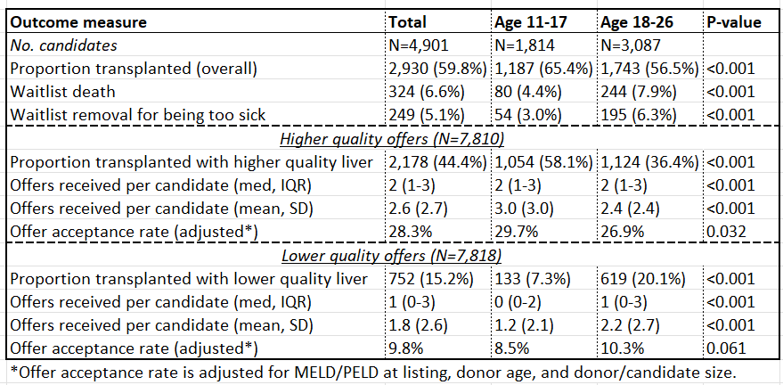 Methods: This was a retrospective cohort study using the SRTR registry and potential transplant recipient file to identify deceased donor liver offers to liver transplant candidates aged 11-26 between 2009-2019. We excluded the following offers: those refused due to size, offers to candidates outside of the first 40 positions on the waiting list, and offers for livers that were ultimately discarded. We additionally stratified the analysis by quality of offered liver, defining lower quality as donation after circulatory death donors, steatotic livers (≥30% macrosteatosis), or donors >40 years old. Our exposure was candidate age: adolescent (11-17yo) vs. young adult (18-26yo). The outcomes compared across age groups included: number of offers received, liver offer acceptance, transplant rate, waitlist mortality, and removal for being too sick. We compared these offer metrics for higher vs. lower quality donor liver offers. Offer acceptance rate was adjusted for MELD/PELD at listing, donor age, and donor/candidate size.