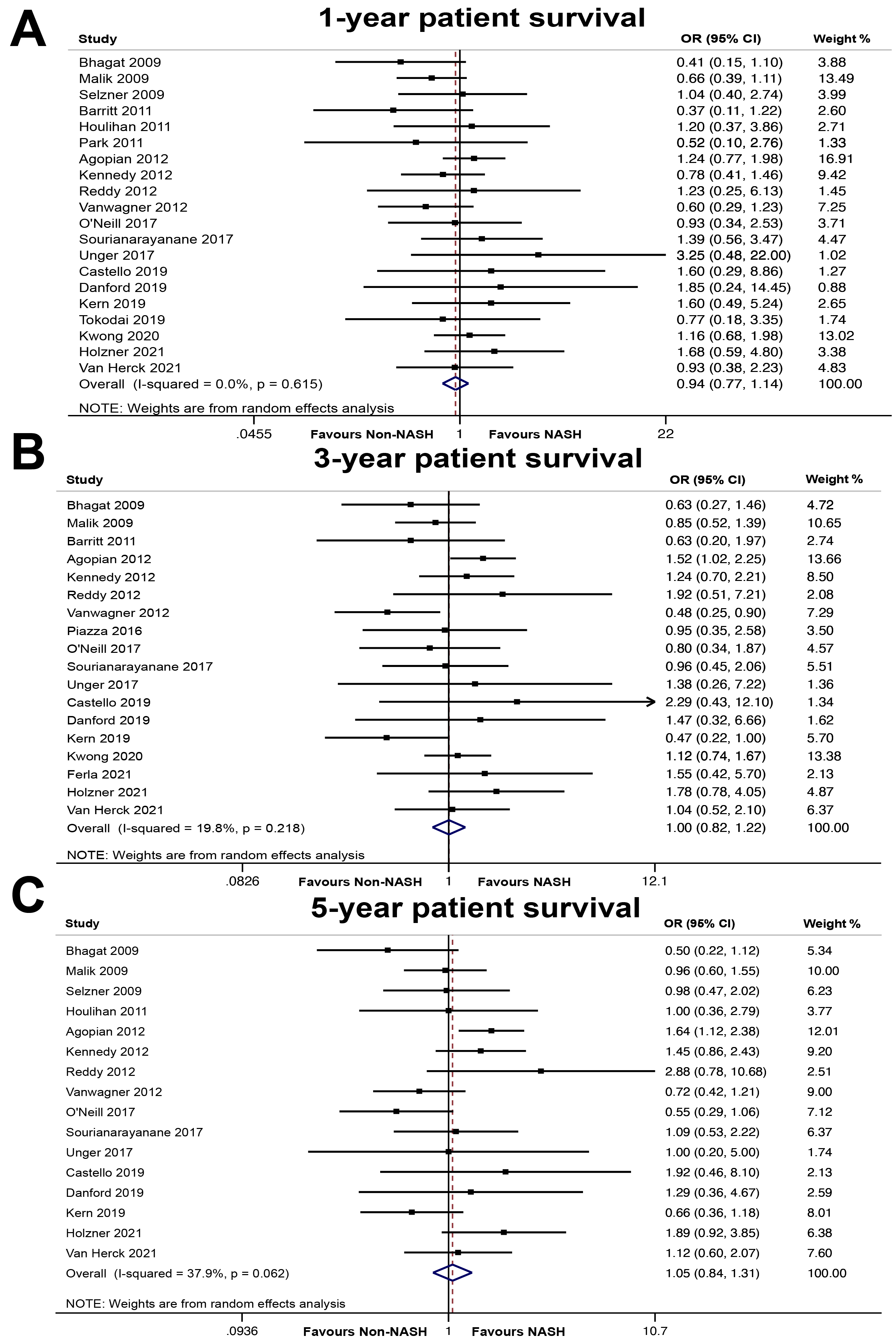 Results: Twenty-two studies with 1,538 NASH and 6,014 non-NASH patients were included. 1- (OR, 0.94; 95% CI, 0.77–1.14), 3- (OR, 0.82; 95% CI, 1.00–1.22), and 5- (OR, 1.05; 95% CI, 0.84–1.31) year patient survival was equivalent between NASH and non-NASH recipients.