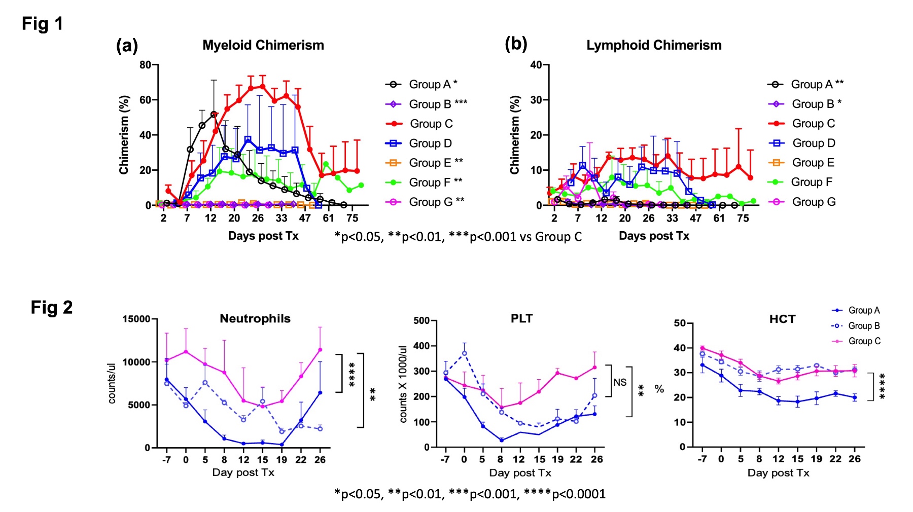 Results: Most recipients treated with 3Gy TBI (Group A) developed mixed chimerism and long-term immunosuppression (I.S.)-free renal allograft survival (Table 1), but suffered from transient but severe pancytopenia. With reduced TBI (1.5Gy), all recipients failed to develop chimerism, and 4/5 developed acute rejection. By adding Vntx, despite the dose of TBI being reduced to half (1.5Gy), all six recipients (Group C) developed significantly superior chimerism (Figure 1) than regimens without Bcl-2 inhibition (Groups A and B), and 5/6 achieved long-term I.S.-free allograft without pancytopenia (Figure 2). With Belatacept in place of anti-CD154 mAb, 2/3 achieved chimerism and long-term I.S. free allograft survival. The current studies also revealed that a minimal non-toxic dose of TBI, TI and CoB remain to be essential for long-term I.S.-free renal allograft survival. Without TBI (Group E) or CoB (Group G), the recipients failed to develop chimerism and rejected allografts despite administration of Vntx. Without TI (Group F), all recipients developed mixed chimerism but failed to achieve tolerance.