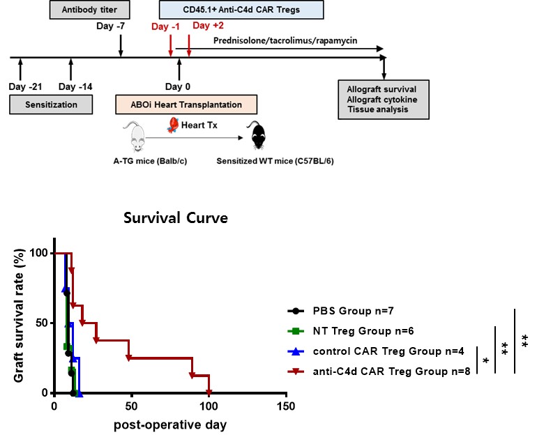 Methods: Intracellular costimulatory domains of anti-C4d CAR Treg consisted of mouse CD3ζ and CD28. CD62L+CD4+CD25+ T cells were sorted and transduced with retroviral CAR using retronection on two consecutive days. We assessed in vitro suppressive function of anti-C4d CAR Tregs against T cell proliferation in response to polyclonal stimulation. Wild-type C57BL/6J mice were sensitized on day -21 and on day -14 by injecting human blood group A-expressing cells. Hearts from human blood group A-transgenic BALB/c mice were transplanted into the sensitized CD45.2+ C57BL/6J mice to make an anti-ABO antibody-mediated rejection model. CD45.1+ non-transduced, control CAR, or anti-C4d CAR Tregs (1×106) were transferred into recipient mice on day-1 and day 2 after transplantation in combination with prednisolone, tacrolimus, and rapamycin. ABOi heart allograft were analyzed for tissue damage, cellular infiltration, and cytokine expression on day 7.