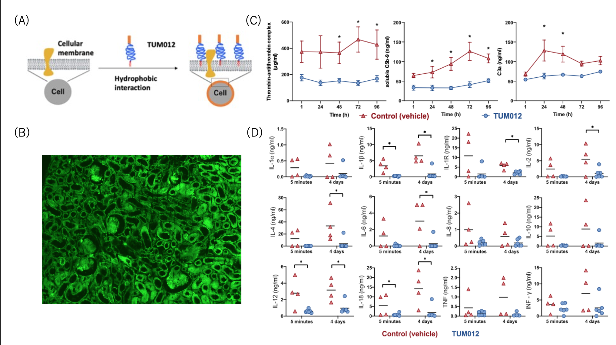 Method: Compiled selected data on two pre-clinical transplant studies are presented: 1) Six pigs underwent allogeneic en-bloc kidney transplantation. The en-bloc kidneys were retrieved from 6 donor-pigs after exposure to 3-5 min in situ warm ischemia followed by 24 hours cold ischemia. Pre-transplant, both kidneys within the en-bloc package were randomly assigned to FITC-conjugated TUM012 (at 2 mg/ml) and vehicle. Post-reperfusion consecutive blood (from graft vein) and tissue samples from both kidneys were taken during an observation period of 6 hours. 2) Ten kidney allografts from 5 donor pigs were exposed to in situ warm and cold ischemia (as study 1) and randomly assigned to 2 groups receiving either TUM012 (n= 6) or vehicle (n= 4). In both studies, TUM012 was given exclusively locally to preserved kidney allografts. Post-reperfusion, local consecutive blood (from transplant vein) and tissue samples were taken intraoperatively. Native bilateral nephrectomy was performed in all recipient animals. Systemic Blood sampling continued daily for a total observation period of 4 days. Biomarkers of thromboinflammation (C5b-9, C3a and thrombin-complex), cytokines release as well as serum creatinine were measured.