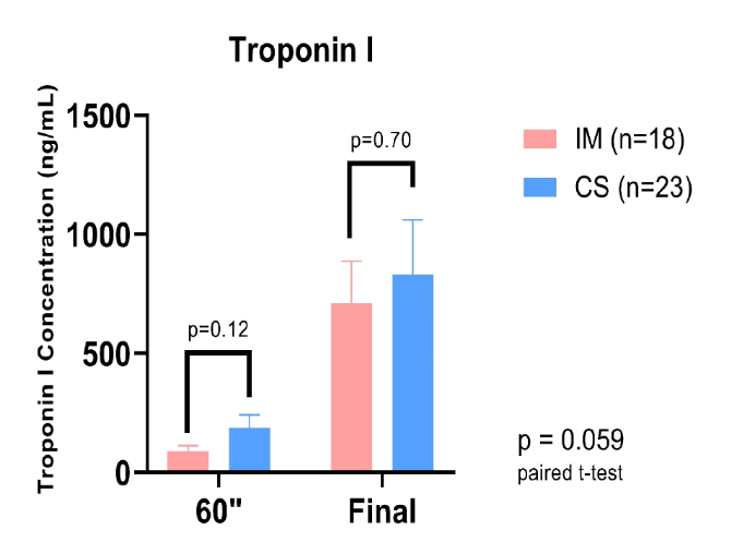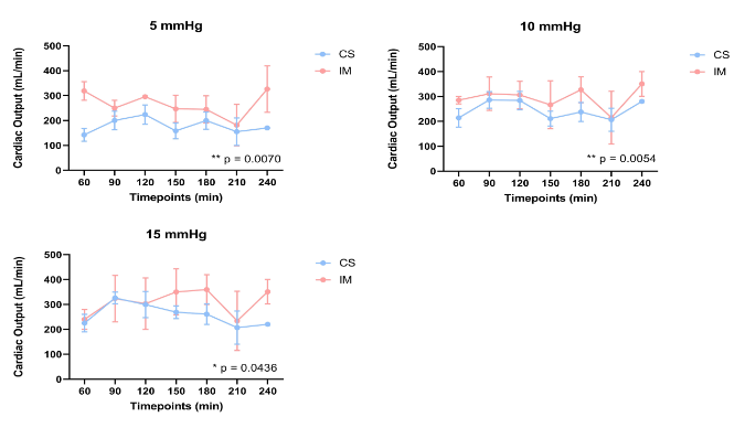 Results: In total, 41 hearts were perfused ex vivo, 23 after CS (TKO + hTG n=14, GTKO.hCD55 n=2, WT n=7), and 18 after IM (TKO + hTG n=15, GTKO.hCD55 n=1, WT n=2). Cardiac output (mL/min) was significantly improved for the IM group at all loading conditions relative to CS, (see figure 1). There was a strong trend toward reduced troponin I release, particularly within the first 60 minutes of perfusion (see figure 2).