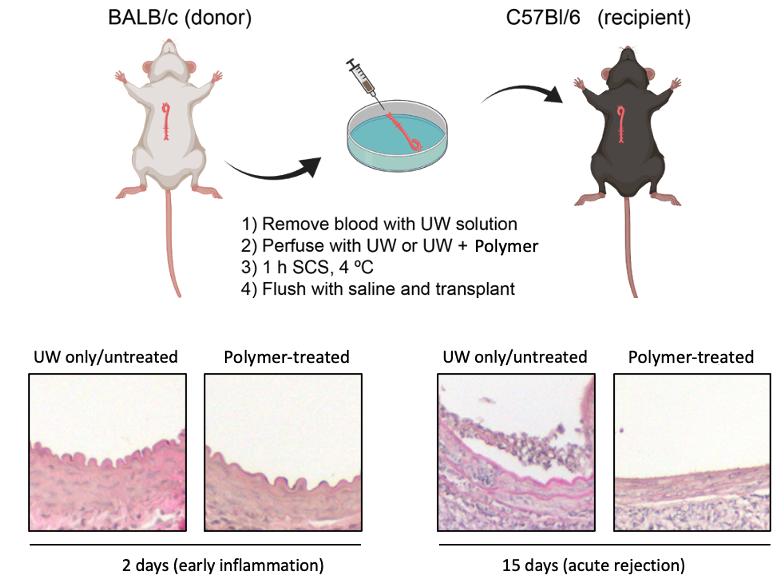 Conclusion: Here, the use of a polymer-mediated organ engineering approach leads to vascular protection that prevents immune-mediated rejection of organ transplants. Ex-vivo delivery of these immune cloaking polymers that engineer the blood vessel lumen allow for localized immune protection, making this an enticing and viable strategy for the reduction in the use of broad-active immunosuppressants post-transplantation. The protocol remains simple and easy to deliver, thereby enhancing its potential clinical applicability. To further validate this novel approach, studies in larger animal models that more closely replicate human transplant conditions are being planned.