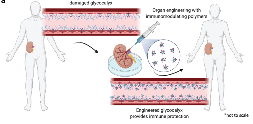 Method: We developed a method using tissue transglutaminase (tTGase) as the surface immobilizing enzyme and polyglycerol polymers containing sialic acid or sulfate moieties that is compatible with UW organ preservation solution at 4°C. In vitro mechanistic studies were performed using EaHy.926 cells to replicate the endothelium and PBMCs and CAR-T cells were used to test immune cytotoxicity. In vivo efficacy of graft rejection was assessed through aortic vessel or renal grafts from BALB/c donor mice into C57BL/6 recipient mice. Polymer treated and untreated grafts were assessed by serology and histology at various timepoints (day 2, 15 and 42 for vessel grafts and day 30 for renal grafts).