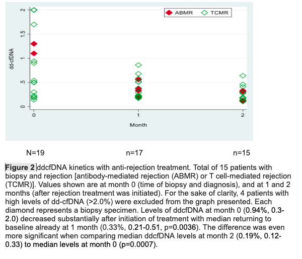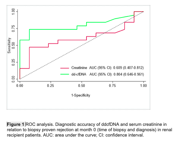 Method: Two groups of renal transplanted patient were assessed. The first group contained newly transplanted patients, from whom samples were collected at month 1, 2, 3 & 5 for ddcfDNA analysis, along with creatinine/eGFR and DSA monitoring. The second group was consisted of patients who underwent a renal biopsy for any cause and whose ddcfDNA were measured at the time of biopsy and 4 weeks afterwards. The biopsy group was further divided in two subgroups, patients diagnosed with rejection (ABMR and TCMR) and patients without rejection. Levels of ddcfDNA were also compared to serum creatinine and eGFR levels. The follow up of the patients lasted for one year. Measurements of dd-cfDNA were done using AlloSeq cfDNA kit (CareDx).