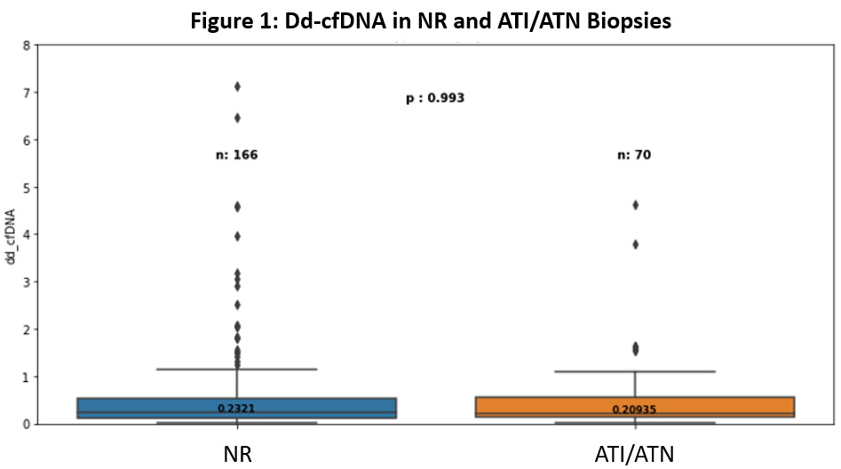 Conclusions: Our findings suggest that acute tubular injury/necrosis is not associated with substantial elevations in dd-cfDNA. The use of dd-cfDNA to identifypatients with non-actionable histologic findings (including ATI/ATN) may allow more nuanced clinical decision-making and reduce the number of unnecessarybiopsies.