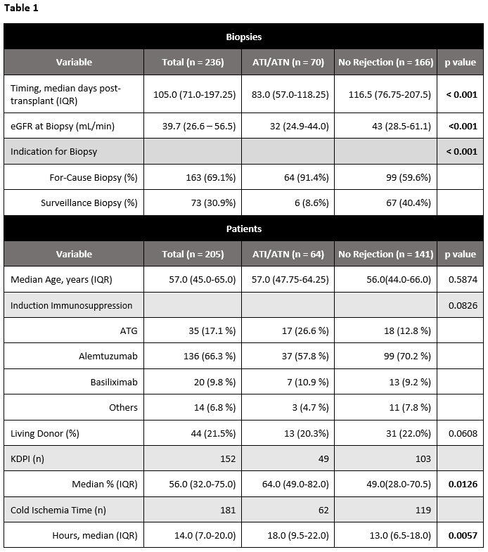 Results: 166 biopsies (141 patients) with NR and 70 biopsies (64 patients) with ATI/ATN were included; compared to patients with ATI/ATN, patients with NRhad lower KDPI (49% vs 64%, p <0.05) and shorter cold ischemia time (13 vs 18 hours, p<0.01). ATI/ATN biopsies were more likely to be for-cause (91.4% vs59.6%, p<0.001), earlier post-transplant (83.0 vs 116.5 days, p<0.001), and occur at lower eGFRs (43 vs 32 mL/min, p<0.001) (Table 1).