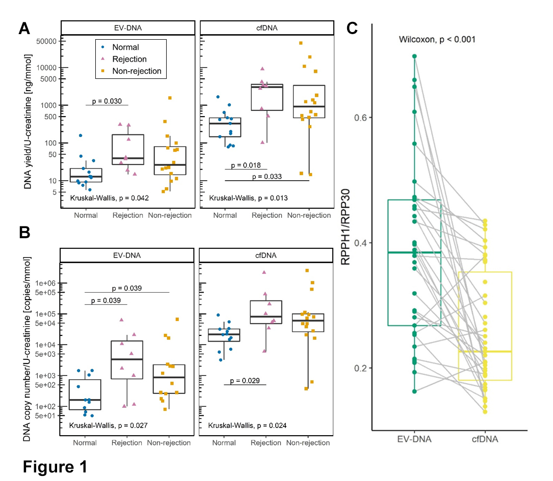 Method: We collected a second morning urine sample from 40 patients before surveillance or for-cause biopsy. We also collected blood and biopsy samples for donor-recipient genotyping. Considering histological analysis, we divided patients into normal histology, rejection injury (combination of antibody- (ABMR) and T-cell mediated rejection (TCMR)), and non-rejection injury group. First, we isolated uEVs (using protocol based on size-exclusion chromatography), their DNA cargo (uEV-DNA), and cfDNA from urine. We used nanoparticle tracking analysis to determine the concentration and size of uEVs. For DNA parameter analysis, including yield, copy number, integrity index, and donor-derived fraction, we used fluorometry and digital droplet PCR. We applied DNase assay and electron microscopy (TEM) immunogold labelling technique to investigate whether DNA was present inside or outside the uEVs.