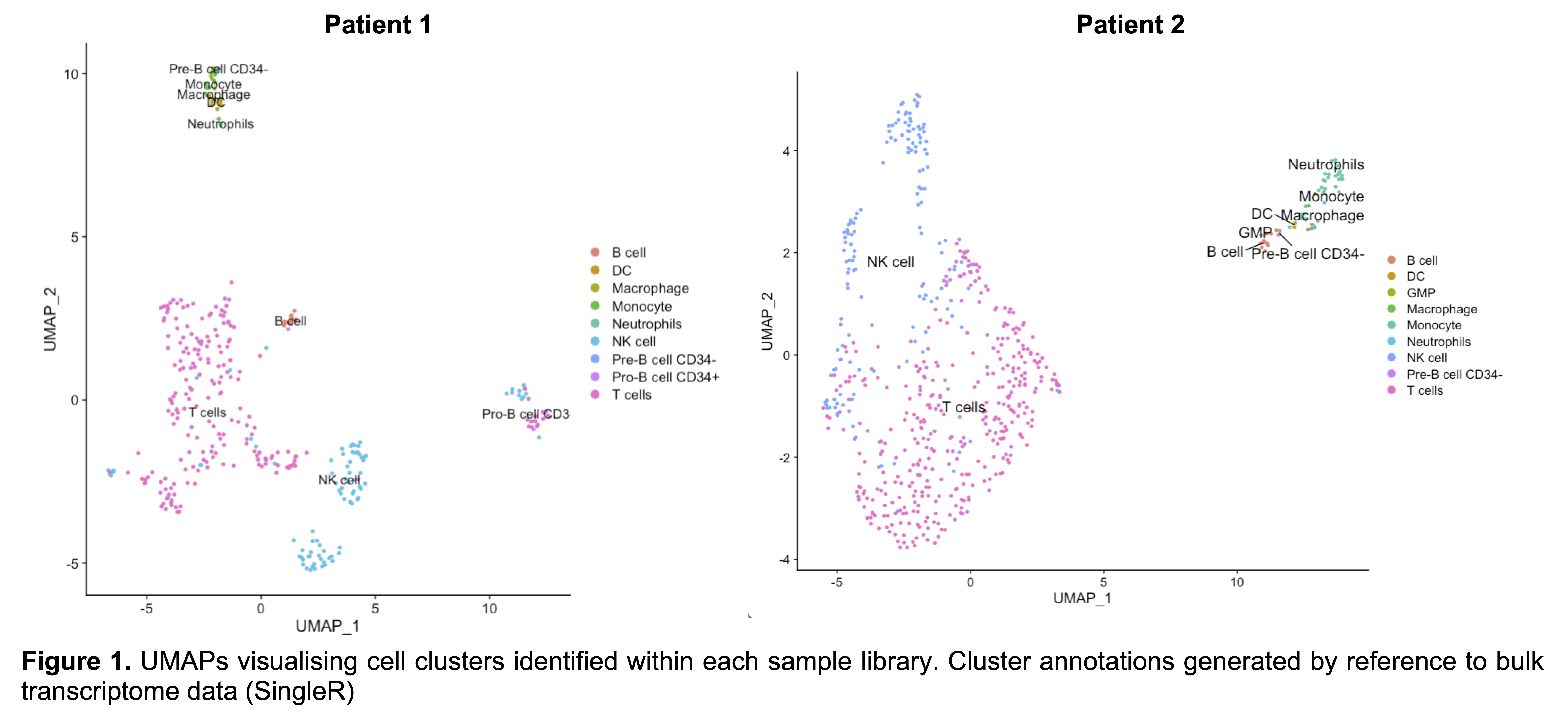 Results: Warm manual enzymatic digestion was found to be the superior method for dissociation. With warm manual enzymatic digestion, a mean of 3906 (2512—6045) live CD45+ cells were isolated. Libraries were successfully generated for two biopsies: the 5-month biopsy from the first patient using the 3’ GEX preparation protocol; and the 9-month biopsy from the second patient using the 5’ GEX protocol. Following QC, a total of 12475 RNA transcripts in 396 cells, and 13128 RNA transcripts in 699 cells were identified in the 5-month and 9-month biopsy respectively. Clustering and automated annotation demonstrated that T cells, followed by NK cells, were the most abundant cell types identified.