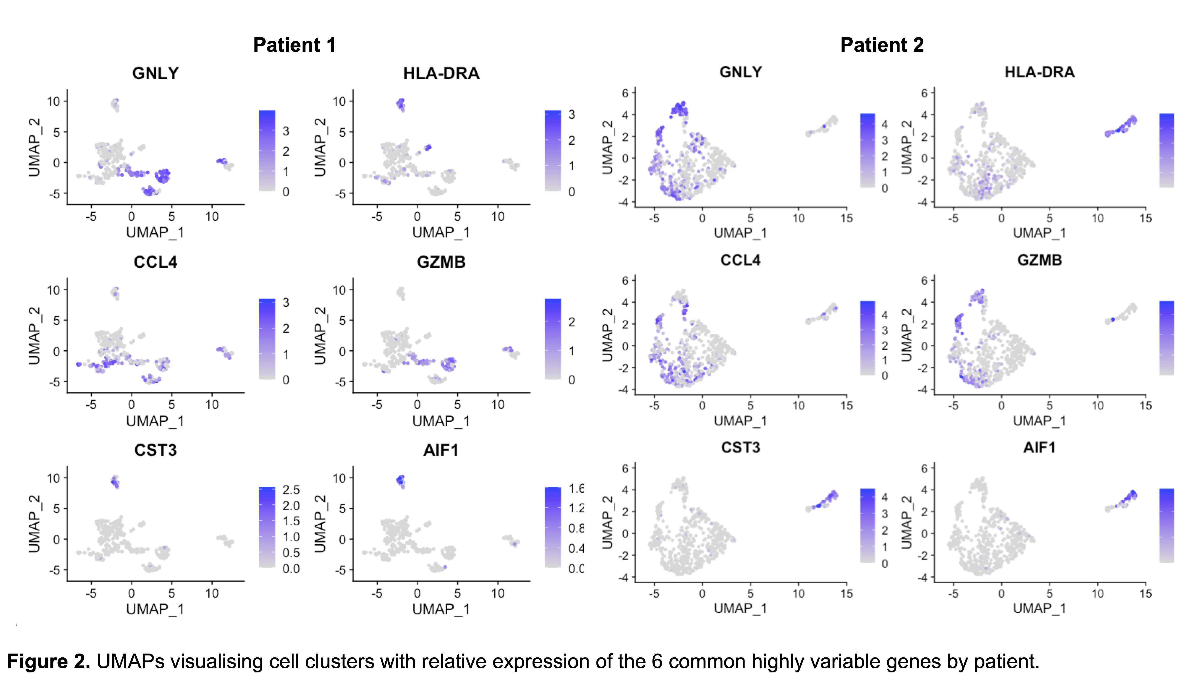 Of the top 20 highly variable genes, 6 were common to both samples (GNLY, HLA-DRA, CCL4, GZMB, CST3, and AIF1). Allograft Inflammatory Factor 1 (AIF1) has previously been identified as a marker of chronic rejection and vascular inflammation whilst Cystatin 3 (CST3) is a biomarker of kidney function. Expression of both these genes localised specifically to the monocyte/macrophage cluster within both samples.