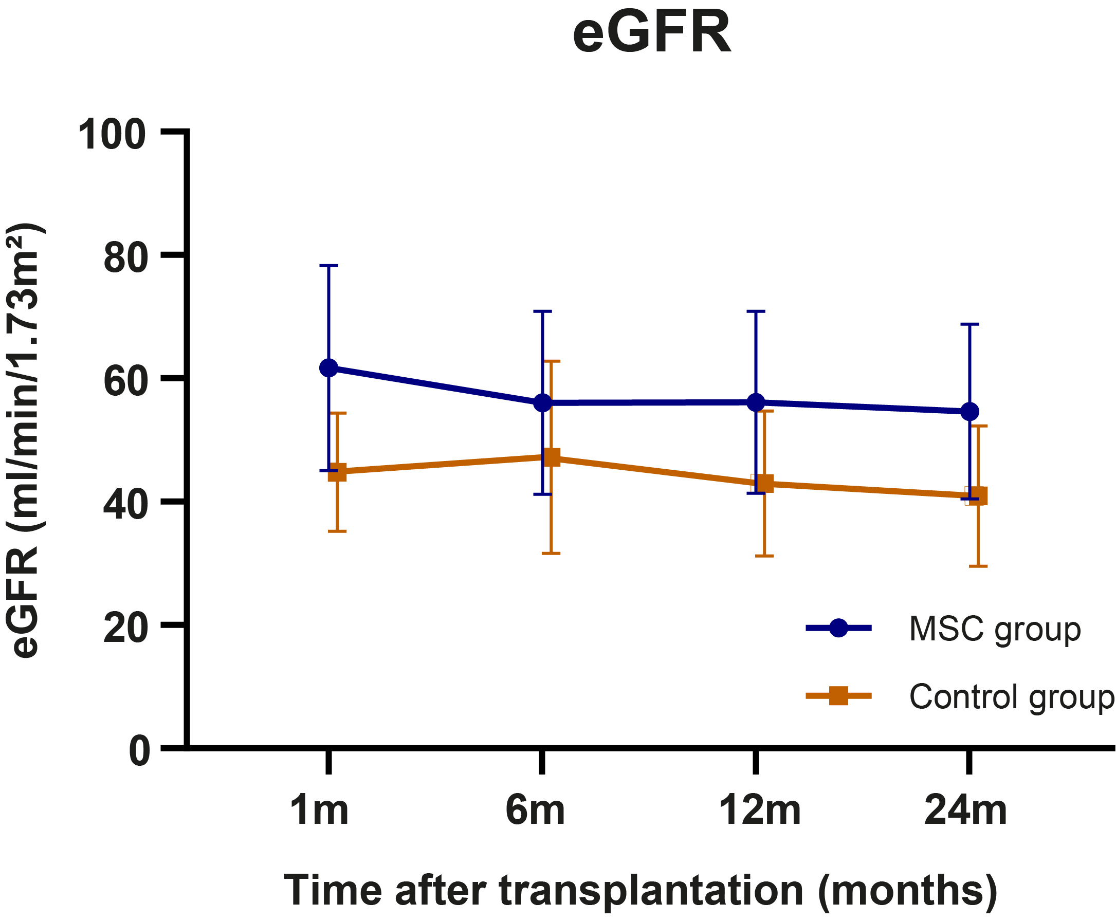 Results: In total, 3 out of 27 patients (11%) in the control group and 11 out of 29 patients (38%) in the MSC group developed dnDSA, of which the majority was directed against HLA-DQ. The majority of DSA were complement binding and had different IgG subclasses. Although patients in the MSC group had an increased rate of dnDSA formation, the degree of antigen mismatch was similar to the control group (Figure 1). Cox regression showed that both MSC treatment group (HR=4.247, P=0.032) and HLA class II antibody-verified eplet mismatch (HR=1.176 per single eplet mismatch, P=0.001) were independently associated with dnDSA development. Despite the increased dnDSA formation in MSC-treated patients, incidence of rejection or graft loss was not increased and eGFR was stable at 2 years follow-up (Figure 2).