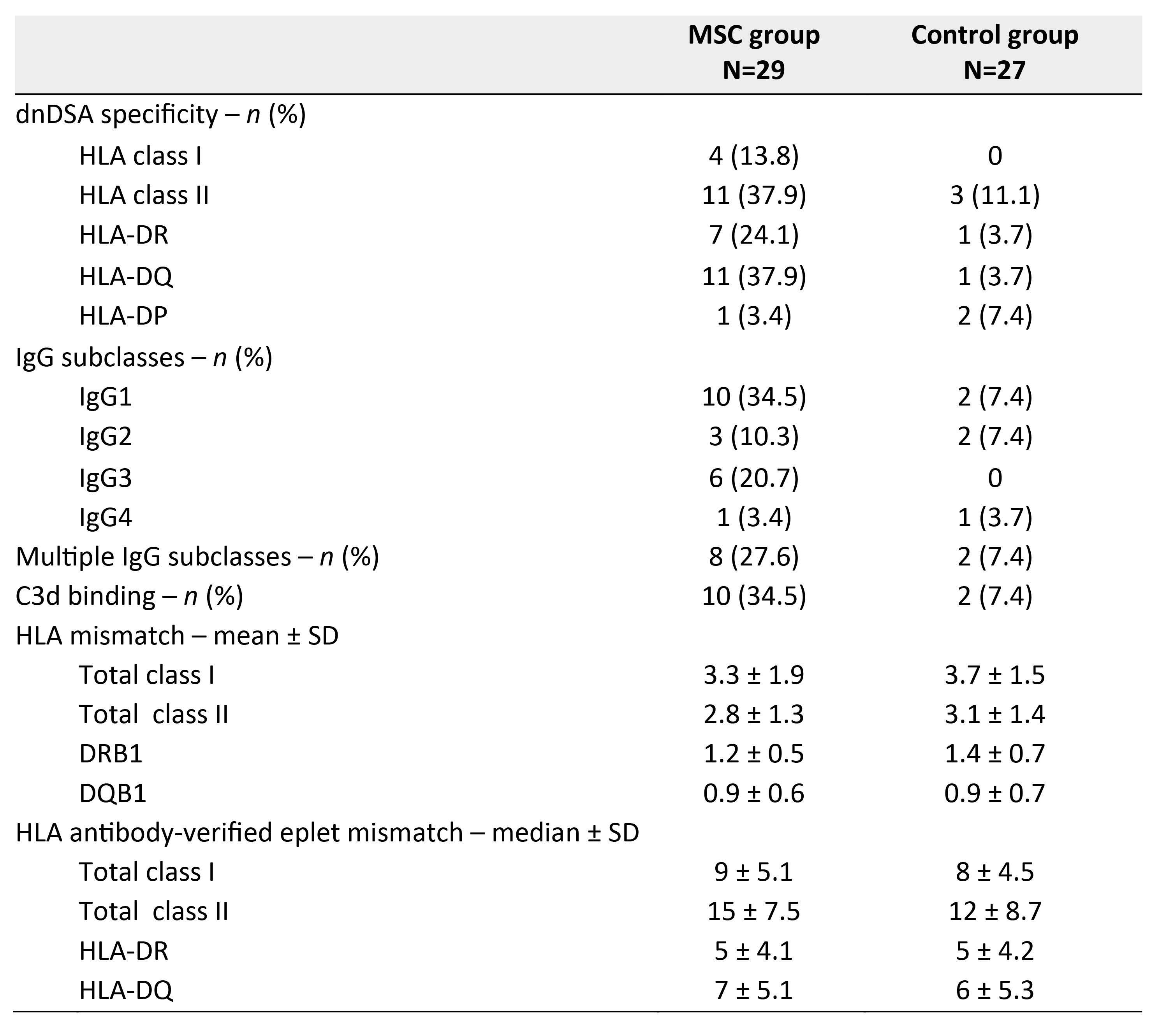 Methods: All patients underwent a first, living-donor kidney transplantation and received alemtuzumab induction, steroids, tacrolimus and everolimus. Patients in the MSC arm of the study received two infusions of autologous MSC at week 6 and 7 post-transplantation. Subsequently, tacrolimus was tapered and completely withdrawn at week 8. Patient sera were tested by luminex single antigen bead (SAB) assays (Immucor) for dnDSA assignment; positivity was defined as MFI > 1000. DSA were further characterized using a modified SAB assay to detect IgG1, IgG2, IgG3 and IgG4 subclasses. Complement binding was assessed with a C3d assay (Immucor). Patients and donors were HLA typed on 11 loci by next-generation sequencing. Eplet mismatches were calculated using HLAMatchmaker 2.0.