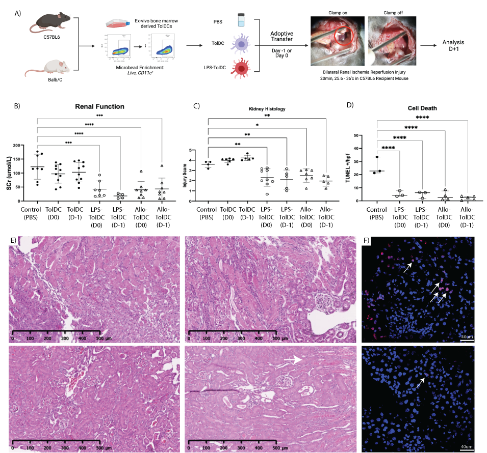 Figure 1: A) overview of adoptive cell therapy in renal IRI. B) Serum creatinine, C) H&E injury scores and D) TUNEL staining results between groups shown. Representative H&E images in E) from PBS and TolDC(top left and right); LPS-TolDC and AlloTolDC (bottom left and right) and F) TUNEL stains control (top) and LPS-TolDC(bottom) kidneys.