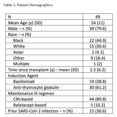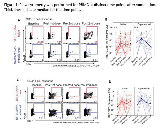 Results: 49 KTRs with a mean age of 54 years were enrolled (Table 1). 10 patients (20.4%) mounted an Ab response following completed vaccination. A history of COVID-19 was associated with an increased likelihood of developing an Ab response (OR: 18.3, 95% CI 3.2, 105.0, p=0.0005). For non-naive CD8+ T cells, a subset co-expressing CD38+Ki67+ was induced 1 week after the 1st immunization in some SARS-CoV-2-naiive patients (P=0.12 versus P=0.14 for SARS-CoV-2-experienced adults, Figure 1A/B). For non-naive CD4+ T cells, induction of a subset co-expressing CD38+Ki67+ was observed at 1 week after the 1st immunization for SARS-CoV-2-naïve participants (P = 0.09 for SARS-CoV-2-naïve, P=0.03 for SARS-CoV-2-experienced adults, Figure 1C/D). For CD8+ and CD4+ T cells, dose 2 stimulated weak induction of the CD38+Ki67+ subset in the SARS-CoV-2-naïve patients only (Figure 1A-D).