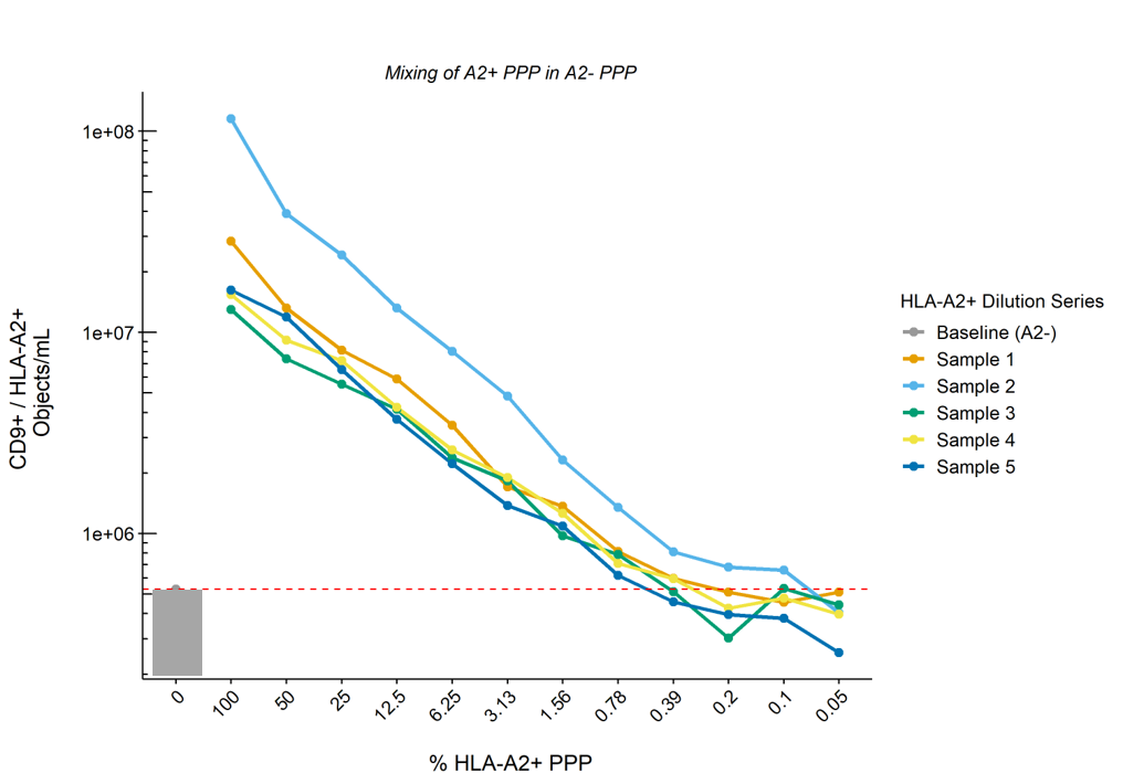 Results: Quantification and comparison of CD9+/HLA-A2+ double-positive EV showed 1.1E7 ± 8.9E6 vs 3.5E5 ± 2.5E5 objects/mL for donor and recipient (pre-KTx) EVs respectively, with recipients A2- EVs concentrations representing background level of the machine. CV values for inter- and intra-assay variability were 16% and 11%, respectively. Serial dilution of A2+ PPP in A2- PPP (n=5) showed a linear reduction in the numbers of CD9+/HLA-A2+ EVs according to the dilution rate whilst total CD9+ EV levels remained unchanged. The lower limit of detection of our protocol was defined as the dilution at which point CD9+/HLA-A2+ EVs dropped below baseline (A2- PPP), and was determined to be ~1% of the concentrations measured in undiluted A2+ PPP (Figure). Measurement of longitudinally collected recipient samples revealed the detection of allograft derived EVs as soon as 3 days – but up to at least 6 months – after KTx.