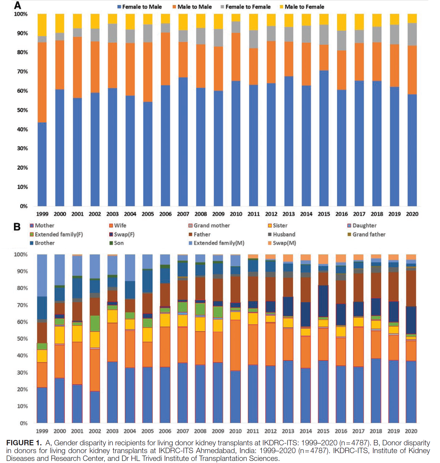 Results: A majority of male recipients have received DDKT. Interestingly, there have, however, also been more male deceased donors (Figure 2A, 2B). Of 831 DDKT recipients between 1997 and 2018 in our center, 68% have been males and 32% females. Overall, female donors constituted 71% of the living donor pool. Female donors are most frequently mothers (33.7%), wives (20.1%), and infrequently daughters (0.4%). When parents donate, it is most frequently the mother (73%). Donation rates of Fathers have increased from 10% in 1999 to 15% in 2020, reflecting a trend that focuses on the well-being of the nuclear family. For married couples, 90% of donors come from wives based on sociocultural reasons and a financial dependency on the husband. Figure 1 indicates that females (mother and wife) contribute to 50% of living donors. The contribution of Mothers increased from 20% in 1999 to 30% in 2020. Donations by other than near-related donors (near-related donors include parents, spouse, siblings, children, and grandparents) declined from 25% in 1999 to 3% in 2020 (Figure 1A, 1B). THOA has permitted kidney exchanges, also called swap transplants since 2011. From 2000 to 2020, 9.3% of all living donors have been through paired kidney exchanges. Female donors have contributed with (78%) to this program. Gender disparities become even more pronounced in pediatric kidney transplantation (Figure 3).