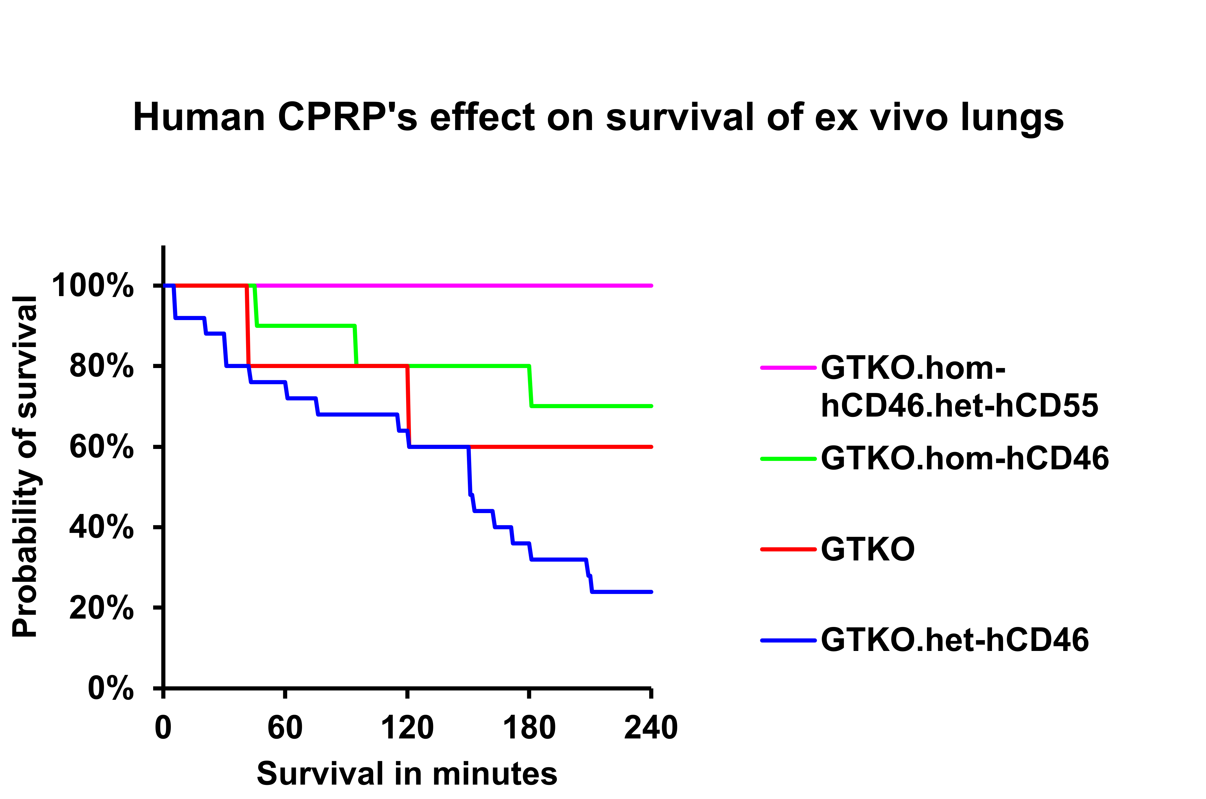 Results: Relative to GTKO.het-hCD46 lungs (139±83min, range 5-240; 6/25 surviving at 4 hrs), survival was significantly improved for GTKO.hom-hCD46 (200±72, range 45-240, p=0.023; 7/9 surviving at 4 hrs) or GTKO.hom-hCD46.het-hCD55 lungs (>240min, p=0.004; 6/6 surviving at 4 hrs). GTKO lungs had similar survival to the GTKO.het-hCD46 lungs (176±41-240, p=0.228; 3/5 surviving at 4 hrs). Surprisingly, GTKO.hom-hCD46.het-hCD55 lungs exhibited a relatively more rapid drop in neutrophils between minute 5 and 60 (p<0.001) and increased histamine and thromboxane B2 elaboration at all time-points (p<0.001). Otherwise, although coagulation pathway activation (F1+2) and platelet activation (CD62P) tended to be lower with increased hCD46 gene dose, there were no consistently significant differences between groups in hematocrit, monocyte or platelet counts, complement activation (C3a), or pulmonary vascular resistance in association with increasing hCPRP gene dose.