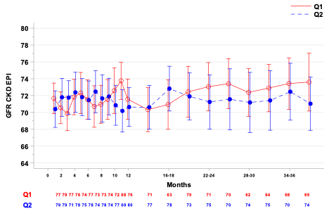 Results: 163 patients initiated the study protocol and received treatment in the q1m control group (n=82) or q2m study group (n=81). Renal allograft function as measured by baseline adjusted eGFR was not significantly different between groups at 36 months (mean [95% CI], q1m: 73.43[70.37, 76.49] vs. q2m: 72.46[69.08, 75.84].