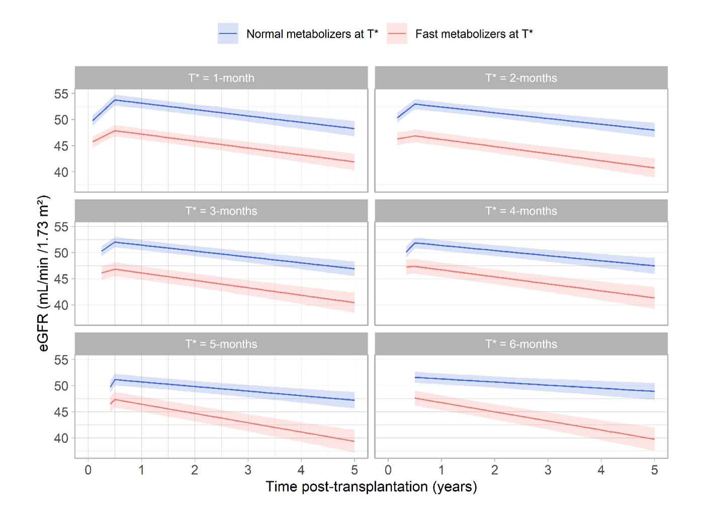 Methods: eGFR up to 5-years post transplantation was analyzed using a linear mixed effect model with random KTR-specific intercepts and slopes in all KTR with a functional allograft at 1-month post-transplantation and undergoing Tacrolimus. The main analysis was performed at T*=1-month; we also studied sub-cohorts at T*=2 to 6-months.